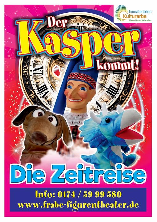 Das frabe-figurentheater lädt zu einem außergewöhnlichen Abenteuer ein: Die Zeitreise. Kasper, Seppel und ihr treuer Hund Flocki entdecken eine magische Uhr, die sie in die Welt der Dinosaurier befördert. Dort treffen sie auf Poldi, einen freundlichen Dino, der ihre Hilfe braucht! Gemeinsam erleben sie spannende und lustige Momente. Doch am Ende werden sie den Weg zurück in ihre eigene Zeit finden.