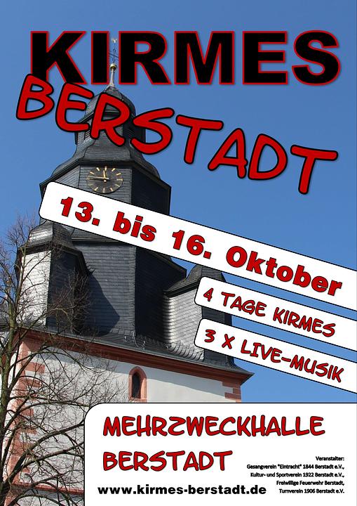 Ein Gottesdienst in der Halle eröffnet den Kirmessonntag um 13:30 Uhr. Während sich die Jüngsten auf dem Rummel vergnügen, spielt in der Halle ab 15 Uhr das Blasorchester des TV 06 Berstadt auf. Mit ihrer Blasmusik werden sie sicherlich wieder für beste Stimmung sorgen und spätestens bei der „Fischerin“ hält es keinen mehr auf den Stühlen. Die Landfrauen bieten wieder selbst gebackenen Kuchen & frisch gebrühten Kaffee an.
