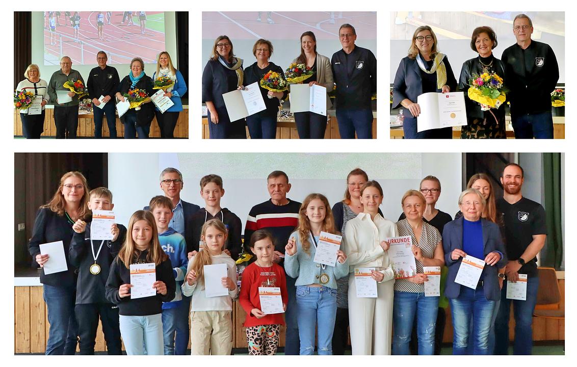 Nach dem Auftritt der Showtanzgruppe Sunshines übernahm der 2. Vorsitzender Benedict Scholl die Ehrung der in 2023 erfolgreichen Leichtathleten. Sophie Barbu, Mats Büttner, Jakob Siehl, Simon Welch, Moritz Dorn, und Lena Müller erhielten für Ihre Kreismeister-/Vizemeister-Titel Pokale oder Erinnerungsmedaillen. Lena Müller hatte zudem den Kreisrekord im Halbmarathon verbessert.