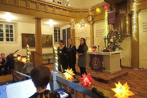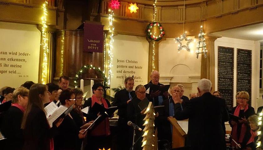 Die Gruppe »Klangzauber« mit Christina Welkenbach, Laura Macan,Veronika Welkenbach und am Klavier Monika Jost begeisterten mit »Leise rieselt der Schnee« und »Sound of Silence«. Es folgte der Liederkranz mit »Advent ist ein Leuchten«, »Es ist ein Ros entsprungen« und »Trommeljunge«, ehe die Honey Twins (Renate Gantz-Bopp und Gerald Reutzel) mit »Winter Song« und »Mistletoe and Wine« die Zuhörer verzauberten. Heike Meiss und Christine Reinhard trugen Weihnachtsgedichte vor, danach brachte Monika Jost am Klavier »Great is the Lord« und »Träumerei« zu Gehör und danach erneut »Klangzauber« mit »Lichter der Weihnacht« und aus Disneys »Eiskönigin« »Let it go«. Der gemischte Chor folgte mit »Ich steh an deiner Krippen hier«, »Es ist für uns eine Zeit angekommen«, ehe Renate Gantz-Bopp mit Hartmut Erker, am Klavier begleitet von Gerald Reutzel, »What a Wonderful World« und »God Bless us, Everyone«, sangen. Noch einmal trat der Liederkranz vor die vielen Zuhörer und erfreute mit dem »Weihnachtskekse-Swing« sowie »Fröhliche Weihnacht«.