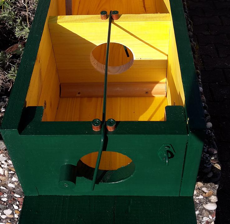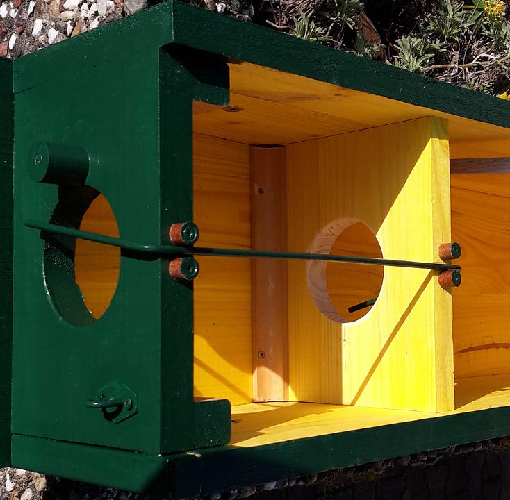 Bild 2 & 3: Dieser Kasten, zwei Einfluglöcher mit einem Pendel, ist ein sehr effektiver Marderschutz.