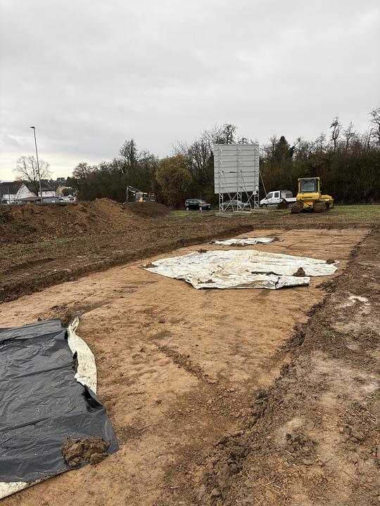 Neben dem Bauschild wurde damit begonnen, eine Baustraße als Zufahrt auf das Gelände herzustellen. Zum Beginn der Woche konnten die ersten Archäologischen Untersuchungen starten. Wie an vielen Stellen in der Wetterau ist man bereits nach kurzer Zeit auf Funde gestoßen, die nun näher untersucht werden müssen. Der offizielle Spatenstich ist in einigen Tagen geplant.