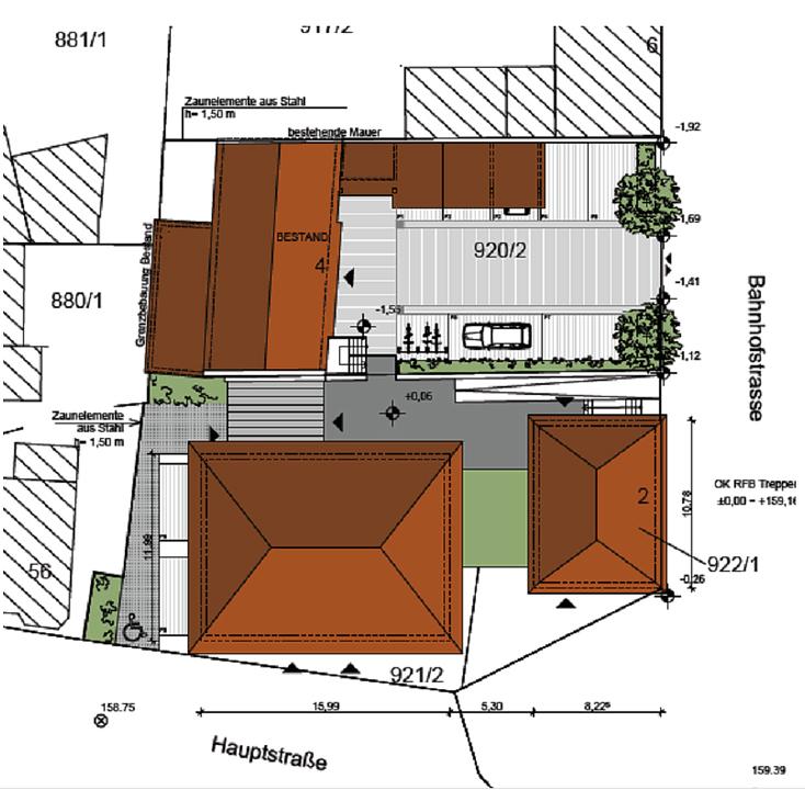Für jede Nutzungseinheit steht unmittelbar auf dem Grundstück ein Stellplatz zur Verfügung. Kun-denparkplätze befinden sich in 50 m Entfernung hinter dem Rathaus - Hauptstraße 60.