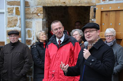 Gegen 14.00 Uhr erklangen weihnachtliche Bläserklänge im Turmhof. Schüler der Singbergschule unter der Leitung von Olaf Scholz hatten sich auf dem Turmkranz platziert und leiteten mit drei weihnachtlichen Stücken die Einweihung ein. Im Anschluss begrüßte Bürgermeister Rouven Kötter alle Anwesenden und ging auf den Verlauf der Sanierungsarbeiten ein. „Noch vor wenigen Jahren war es fast unmöglich auf die Spitze des Turmes zu gelangen. Pünktlich zum 600jährigen Jubiläum im Jahr 2008 konnte der Innenraum fertiggestellt werden, und es ist möglich über die eingezogenen Böden und Treppen den Turm zu erklimmen und sogar in ihm zu heiraten. Mit der nun ebenfalls sanierten Außenfassade, dem angrenzenden Trauzimmer mit Empore, dem Innenhof, der Kinderstube und dem neu erschlossenen historischen Zugang erstrahlt unser Wahrzeichen in einem Glanz wie nie zuvor.“ so Kötter. Er dankte allen Mitarbeitern der Verwaltung, die an den Bauarbeiten beteiligt waren, sowie den ausführenden Baufirmen. Teilweise sei es nicht einfach gewesen Vorhaben wie das mit Schiefer eingedeckte Dach gegenüber dem Denkmalschutz durchzusetzten um das Gebäude dauerhaft zu erhalten.
