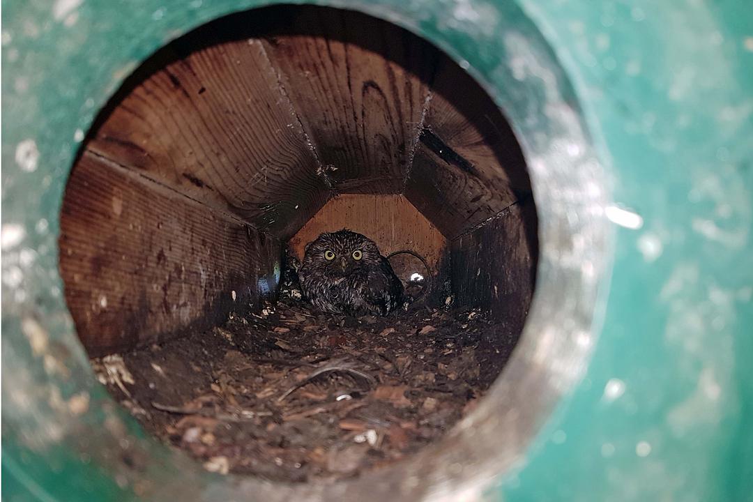 4 Röhren hatten Stare belegt. Das erkennt man daran, dass sie viel Stroh eingetragen haben. Der Steinkauz bringt kein Nistmaterial in die Röhre.