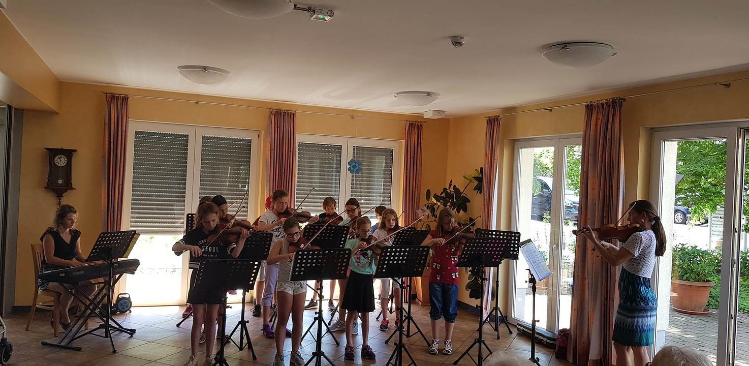 „Bitte, kommt bald wieder“ – Kinder der Geigengruppe des Fördervereins Wölfersheimer Schulen besuchen das Seniorenzentrum Wölfersheim