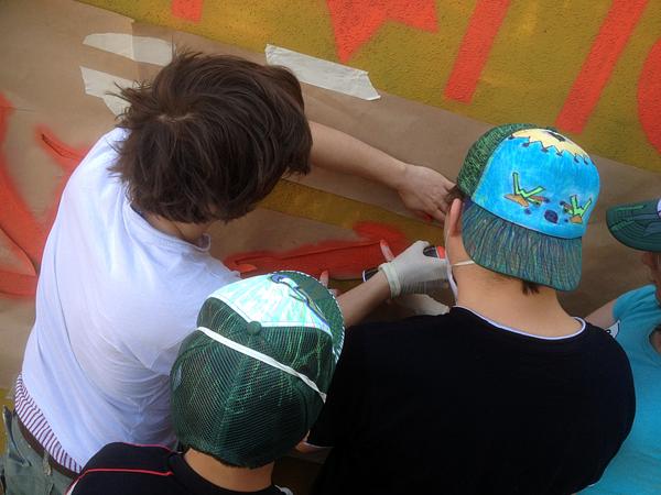 Die Jugendpflege der Gemeinde hatte in den Osterferien zum Workshop eingeladen. In einer kleinen Gruppe hatten die Jugendlichen die Gelegenheit verschiedene Techniken beim Graffiti in Theorie und Praxis zu erlernen. Darüber hinaus informierte Sobek verständlich über die rechtlichen Grundlagen, also unter welchen Bedingungen man wo sprühen darf. Neben eigenen Caps wurden zwei Wände besprüht. Die Garage der Gemeinde am Jugendzentrum wurde mit verschiedenen Mustern und Schriftzügen gestaltet. Auf ihr findet man den großen Schriftzug „practice tolerance“. In ihm sind verschiedene Symbole eingearbeitet, die Religion, Geschlechter und anderes darstellen sollen. Ein wichtiger Teil des Projektes ist laut Sobek, dass sich die Jugendlichen mit der Thematik des Motivs beschäftigen. Auch Bürgermeister Rouven Kötter zeigte sich erfreut über den angebotenen Kurs. „Viele Jugendliche reizt es, einfach mal mit der Sprühdose auf eine Wand zu sprühen. Das geschieht oft ohne einen qualitativen Anspruch oder ein genaueres Ziel - hier lockt eher das Verbotene. Die Teilnehmer dieses Workshops werden mit großer Wahrscheinlichkeit nicht an Straßenlaternen sprühen, wenn einer von ihnen künftig eine Dose in die Hand nimmt, dann eher mit dem Ziel, ein ansprechendes Motiv zu gestalten.“ so Kötter.