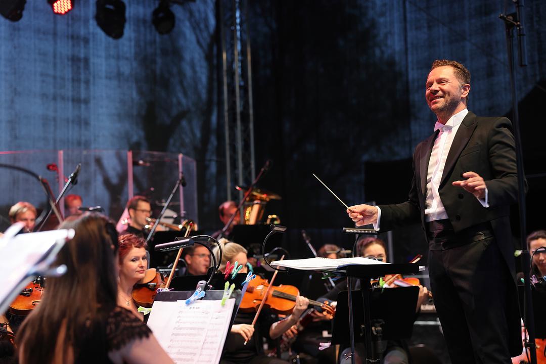 Entsprechend wurde das Jubiläumskonzert auch gefeiert: Pathetische Filmmusik, pulsierender Crossover und schicke Klassik waren im Konzertprogramm dicht miteinander verbunden. Mit Georges Bizets temperamentvollen „Les Toreadors“ ließ Maestro Martin Panteleev das Orchester feuerwerksartig den Abend eröffnen, um dann gleich mit Johann Strauß‘ „Kaiserwalzer“ ins elegant-edle Fach zu wechseln – geschmeidige Dreivierteltakt-Melodien, garniert mit hellen Fanfaren und feiner Tonmalerei. Sicher spielt jeder Dirigent auch noch ein Musikinstrument – die wenigsten dürften allerdings so exzellent Geige spielen wie Martin Panteleev. Für das große Violinsolo aus Morricones Filmmusik zu „Romanza Quartiere“ griff er zur Geige und ließ das schwelgerische Solo leuchtend und emotional über der Arena schweben. Begeisterter Applaus war die wenig überraschende Reaktion. Ennio Morricones Hauptthema zu „Cinema Paradiso“ ist gegenüber dem Geigensolo ein richtiggehendes kleines Klavierkonzert. Der Pianist Vytis Sakuras zauberte den Solopart eloquent und perlend und gestaltete gemeinsam mit dem subtil kammermusikalisch musizierenden Orchester eine duftig-nostalgische Klangwelt von großer Raffinesse und Schönheit. Mit der Pop- und Musicalsängerin Katrin Glenz konnte die Arena am See eine so charismatische wie facettenreiche Solistin erleben. Arios und glanzvoll bei „Never enough“ aus „The Greatest Showman“ glänzte die Kronbergerin genauso wie rockig druckvoll bei „First Day of my Life“ von Melanie C. Die groovende Szenerie des Kultfilms „Dirty Dancing“ brachte Glenz mit drei Titeln aus dem Tanzfilm von 1987 auf die Bühne – warm-romantisch mit „Time of my Life“ bis mit knackigem Rock’n Roll bei „Be my Baby“ und „Yes“, mit denen die Sängerin schon mitten in der ersten Konzerthälfte das Publikum von den Stühlen holte. Mit einer faszinierenden Mixtur aus ungarischer Folklore und metropolitanem Sound, den das Capitol Symphonie Orchester in der Orchesterierung von Frank Heckel glänzend umsetzte, führte Detlev Petersens „Down in Budapest“ temperamentvoll ins Finale. Klaus Badelts Geniestreich der „Pirates of the Caribbean“, von Dirigent Panteleev virtuos mit Energie, Rhythmus und Farbenreichtum inszeniert, stellte dessen einen Teil, John Miles Meisterwerk „Music“ mit dem beseelten Gesang von Katrin Glenz den anderen; beides vom Publikum begeistert gefeiert. Für Begeisterung sorgte auch Ralph Philipp Ziegler, der mit seinen humorvollen und hintergründigen Moderationen durch das Programm führte.