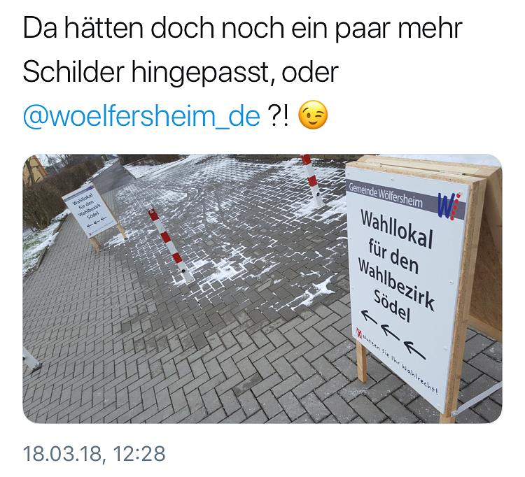 Ich schau zwischendurch mal auf Twitter und stelle fest, dass man sich über unsere Beschilderung der Wahllokale lustig macht. Sorry, aber auf so etwas steht die öffentliche Verwaltung halt total. Bevor es jemand nicht findet stellen wir lieber ein Schild mehr auf. Geradeaus und dann links ist doch nicht viel.