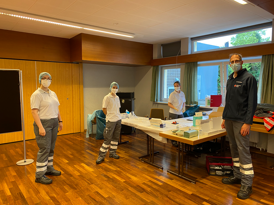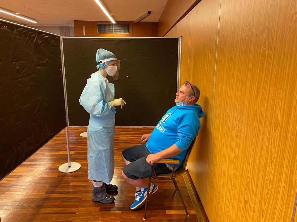 Künftig sollen an jedem Sonntagnachmittag von 15.00 bis 18.00 Uhr in den Vereinsräumen der Wetterauhalle Tests angeboten werden. Buchungen dafür sind über das Buchungsportal des Corona-Testcenters des DRK Wölfersheim möglich. Der Link dazu ist auf der Homepage der Gemeinde unter www.woelfersheim.de veröffentlicht. Dort findet man auch den Link zum Onlinekalender der Linden-Apotheke. Bürgermeister Eike See und die im Rathaus zuständige Mitarbeiterin Martina Schmitt überzeugten sich vor Ort vom Angebot. „Es freut mich, dass wir die Kapazitäten vor Ort steigern und den Bürgerinnen und Bürgern ein zusätzliches Testangebot bieten können. Die Gemeinde stellt mit der Wetterauhalle eine geeignete Infrastruktur zur Verfügung. Mit dem Deutschen Roten Kreuz Ortsverband Wölfersheim haben wir einen zuverlässigen Partner mit geschultem Personal gefunden, um die Tests für unsere Bürger sicher durchzuführen,“ freut sich Bürgermeister Eike See. Am ersten Tag konnten insgesamt 37 Personen getestet werden, womit sich die Ehrenamtlichen sehr zufrieden zeigten. „Ablauf und Durchführung haben super geklappt,“ berichtet Michael Surmann im Nachgang. Für nächste Woche möchte man zusätzlich noch die Benachrichtigung per Mail und für Kinder einen Spucktest anbieten. Dieser Spucktest ist offiziell zugelassen, hat aber eine etwas niedrigere Trefferquote. Für Kinder ist er aber viel angenehmer.