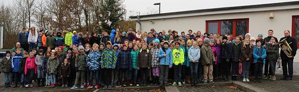 Gesponsert vom Lokalen Aktionsplan Mittlere Wetterau „Bunter Leben“ und geschmückt von den Schülerinnen und Schülern der 5. Klassen der Förderstufe und des Gymnasiums wurde seine Aufstellung in einer kleinen Feierstunde mit weihnachtlichen Klängen des Trompetenensembles der Singbergschule unter der Leitung von Musikkoordinator Christoph Scholz und in Anwesenheit aller Klassen 5 durchgeführt. Schulleiter Thomas Gerlach begrüßte die Schülerinnen und Schüler mit ihren Klassenleiterinnen und Klassenleitern sowie Bürgermeister Rouven Kötter, den 1. Vorsitzenden des Fördervereins Wölfersheimer Schulen Eike See, den Kulturdezernenten Sebastian Göbel, Roxane Mentes vom Lokalen Aktionsplan, Rektor Bardo Langsdorf, Rektorin Nikola Lenz, Rektor Thomas Küchenmeister, Direktorin Renate Schäfer und den Leiter des Gymnasialzweigs Christian Kneipp. Alle wiesen in ihren Ansprachen darauf hin, dass diese Weihnachtsbäume, die in den vier Gemeinden Reichelsheim, Echzell, Florstadt und Wölfersheim aufgestellt wurden, für Integration, Vielfalt und Respekt stehen. Es gehe darum Toleranz dem Mitschüler gegenüber zu fördern und damit seine eigenen Kompetenzen zu stärken. Die Schule habe mit all ihren unterschiedlichen Schülerinnen und Schülern, die aus vielen Gemeinden der Region kommen und hier unterrichtet werden, ihre Integrationsfähigkeit bewiesen und allen eine neue schulische Heimat gegeben. Bürgermeister Kötter betonte, dass Wölfersheim so bunt wie der Weihnachtsbaum sei, der vom Schulgelände über Wölfersheim hinausstrahle. Er ging insbesondere auf die aktuelle Flüchtlingsthematik ein und warb bei den Schülern für Offenheit und Verständnis.