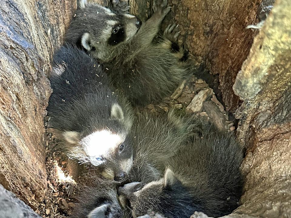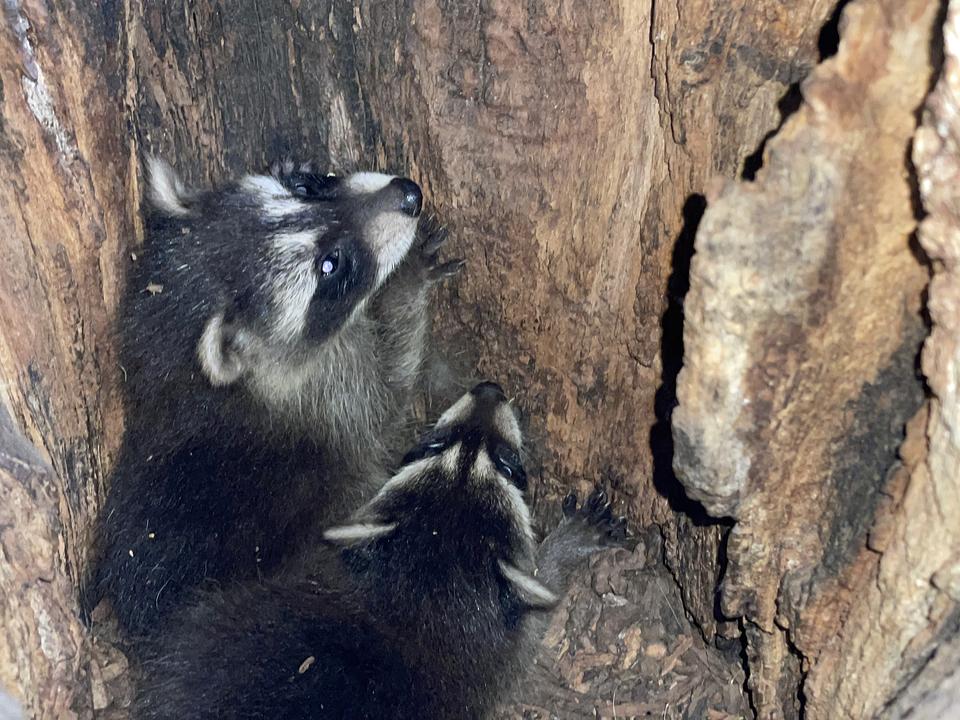 Bei der Kontrolle der Steinkauzröhren im Bereich Singberg hörten wir direkt unterhalb der Röhre in einem Aststumpf ein „merkwürdiges“ Ziepen. In dem Ast befand sich eine etwas größere Höhle und darin vier junge Waschbären. Ein beeindruckendes, interessantes und schönes Bild. Aber es hat auch eine Schattenseite! Bisher waren wir der Meinung, er wäre nur in den Wäldern aktiv. Gerade im Södeler Wald hatte er schon kräftig die Nistkästen geräubert, und wir mussten sie aufwendig mit einem Waschbär Schutz versehen. Jetzt wissen wir, dass er auch in den Streuobstwiesen aktiv ist, die Nistkästen dort müssten auch geschützt werden. Klingt einfach, ist aber einiges an Arbeit.