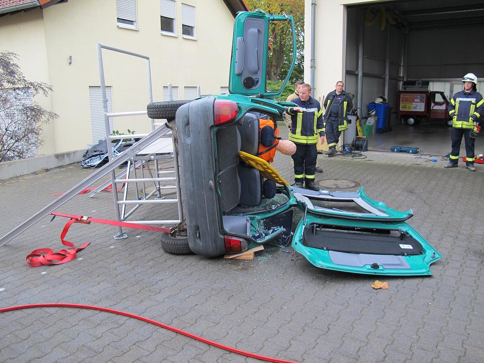 Noch vor dem Mittag ging es dann nach draußen, wo die Fahrzeuge schon bereit standen. Aufgeteilt in zwei Gruppen wurden zum einen die Grundlagen im Umgang mit dem Hydraulischen Rettungsgeräten "Schere und Spreizer" geübt. In der anderen Gruppe wurden Rettungsmethoden aus sogenannten "Sonderlagen" geübt, hierzu wurden die "Unfallfahrzeuge" zuvor auf die Seite oder das Dach gelegt - Situationen, die so im Ernstfall auch immer wieder auf uns zukommen können.