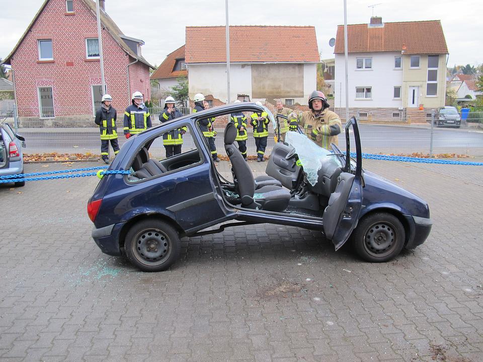 Der Tag begann für uns bereits um 8 Uhr morgens. Zwei Kameraden von der AG BFT (Arbeitsgemeinschaft Brandschutz, Feuerwehr und Training e.V.) aus Allendorf waren bei uns zu Gast. Angefangen wurde zunächst mit einem theoretischen Teil, bei dem die Grundlagen und Vorgehensweisen der Rettung bei Verkehrsunfällen erläutert wurden. Außerdem haben wir erfahren, worauf insbesondere bei den heutigen modernen Fahrzeugen zu achten ist. Die moderne Elektronik und Sicherheitstechnik wie Airbags, machen zwar das Fahren sicherer, aber die Feuerwehr hat es dadurch nicht unbedingt leichter bei der Rettung und muss auch zur eigenen Sicherheit viel beachten.