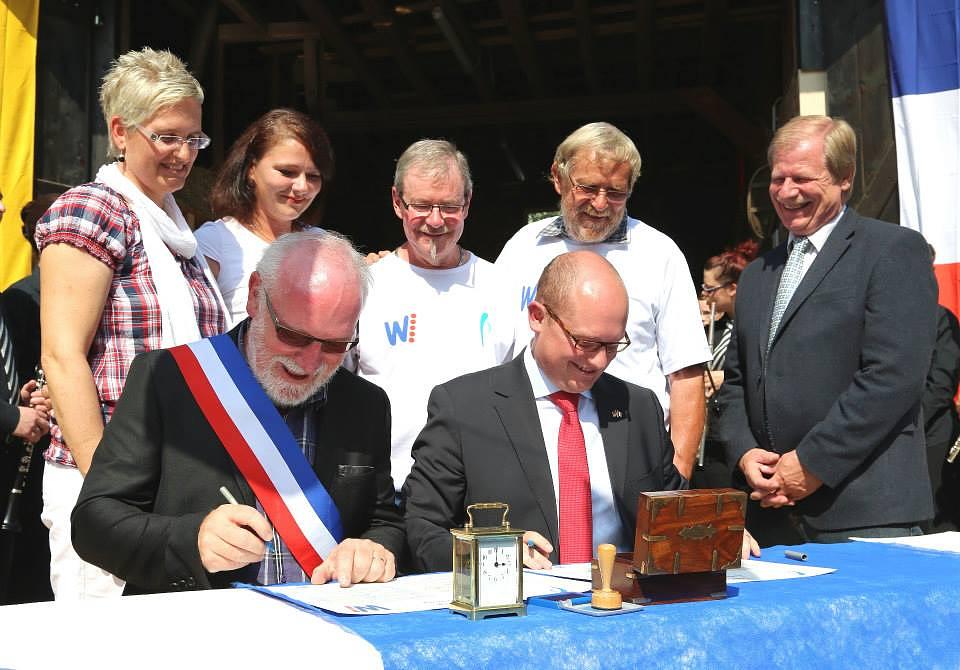 Das vergangene Wochenende stand in der Gemeinde Wölfersheim ganz im Zeichen unseres französischen Nachbarlandes. Vor dem Rathaus wehte die europäische, die deutsche und die französische Fahne. Am Samstag zeigte man im Kinosommer einen Film im französischen Originalton, und auch der Markt der Regionen war mit französischen und deutschen Fahnen geschmückt. An vielen Ecken der Gemeinde und bei zahlreichen Gelegenheiten konnte man die französische Sprache hören und spüren, dass etwas Besonderes in Wölfersheim vor sich ging. Dies hatte auch seinen Grund: Eine 24-köpfige Delegation aus L’isle sur le Doubs in der Region France Comté war zu Besuch in Wölfersheim, um den in beiden Kommunen beschlossenen Partnerschaftsvertrag offiziell zu unterzeichnen.