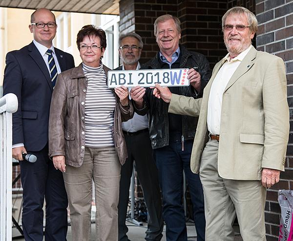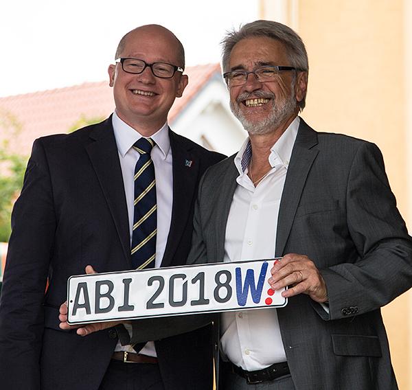 Bürgermeister Rouven Kötter sprach von Superlativen, die den heutigen Tag umgeben. Man solle sparsam damit umgehen, aber angesichts der Entwicklung der Wölfersheimer Schule und dem nun vorhandenen Bildungsangebot für die Region seien sie angebracht. Kötter beschrieb seine eigene Schulzeit, die in diesem Gebäude begonnen habe und zeichnete noch einmal die Entwicklung dieses historischen Gebäudes nach, das bereits 1934 von der Gemeinde Wölfersheim gebaut wurde und in das man heute mit der neuen Oberstufe zurückkehre. Der Bürgermeister bedankte sich bei allen, die schnell und unbürokratisch an der Renovierung und Bereitstellung gearbeitet haben, um diesen Tag möglich zu machen. Nun verfügen Wölfersheim und die Region über ein komplettes schulisches Bildungsangebot, in dem man alle Abschlüsse erwerben könne. Als Andenken und Zielvorgabe überreichte er den Gremien und der Schulleitung Autoschilder mit der Aufschrift ABI 2018 und dem Wölfersheim Logo. Landrat Joachim Arnold betonte, dass er ebenfalls seine Schulzeit in diesem Hause begonnen habe. Er dankte Thomas Gerlach, der gesamten Schulleitung, dem Kollegium und der Schulgemeinde für das Engagement für den gemeinsamen Weg bis zum heutigen Stand der Schulentwicklung. Die „Geburt“ einer Oberstufe im ländlichen Bereich sei ein besonderer Anlass, auf den man nicht nur als Wölfersheimer sondern auch als Bürger der gesamten Wetterau stolz sein könne.
