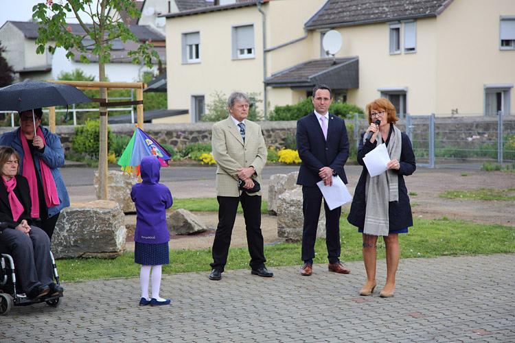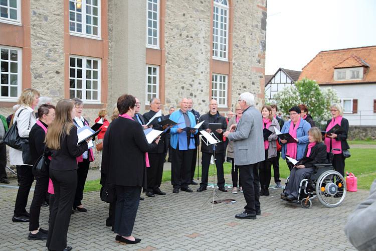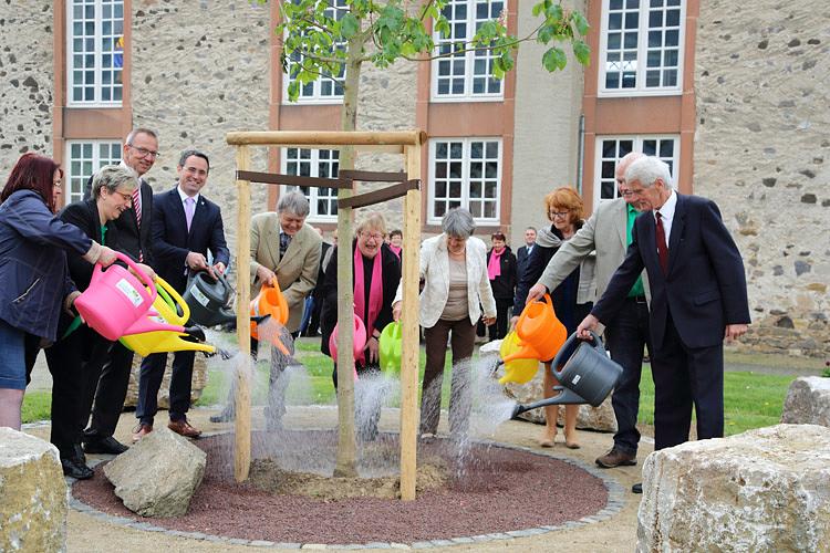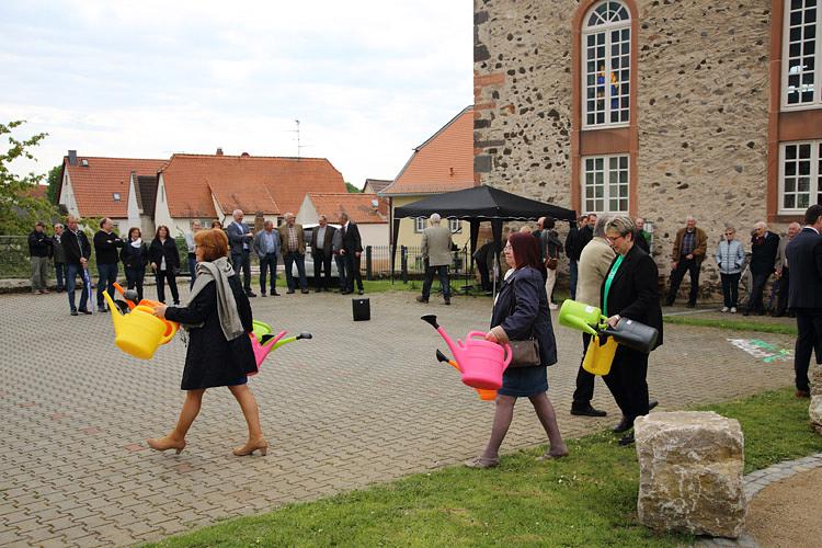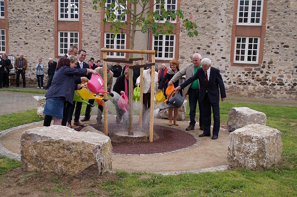 Nach einem Gottesdienst, der vom Präses des Evangelischen Dekanats Wetterau, Tobias Utter, unter Mitwirkung des Gesangvereins Liederkranz durchgeführt wurde, fand eine kleine Feierstunde auf dem Kirchhof statt. Die kurz zuvor schon gepflanzte neue Kastanie wurde von Magda Gerlach, in Erinnerung an die, bis 2004 an gleicher Stelle befindliche, alte Schulhofkastanie in Melbach willkommen geheißen. Der langjährige, ehemalige Lehrer am Grundschulstandort Hanspeter Knobloch erinnerte mit seinem Gedicht „Starke Wurzeln“ an die alten Zeiten und brachte seine Freude über den neuen Baum als Zeichen der Verbundenheit mit Melbach zum Ausdruck. Sebastian Göbel und Thomas Gerlach sangen, passend zur Baumpflanzung, den Titel „Der Baum des Lebens“. Bürgermeister Eike See lobte sein Bauhof-Team für die geleistete Vorarbeit und rief anschließend Magda Gerlach, den Schirmherren Joachim Arnold, Karl-Ernst Kunkel, Carmen Körschner, Hanspeter Knobloch, Inge Kleberger und die Vereinsmitglieder Heike Marloff, Heike Meiss und Wolfgang Weller zum Angießen des Baumes auf. Zur Mittagszeit lud der Verein „Gemeinsam für Melbach“ zu einem Imbiss in das evangelische Gemeindehaus ein, an dem auch die 1. Kreisbeigeordnete Stefanie Becker-Bösch teilnahm.