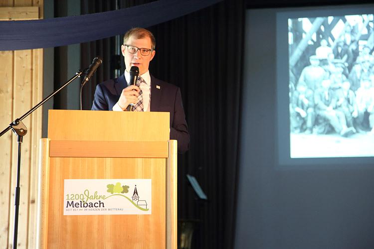 Der 1. Vorsitzende von „Gemeinsam für Melbach“ Karl-Ernst Kunkel fasste in seiner Festrede noch einmal die bisherigen Aktivitäten der 1200-Jahr-Feier von der Vereinsgründung bis zum heutigen Tag zusammen. Ein besonderer Dank ging an die beiden Schirmherren und an die Gemeinde Wölfersheim für die hilfreiche Unterstützung in allen Bereichen. Karl-Ernst Kunkel wies auch auf die noch folgenden Veranstaltungen bis zum Jahresende hin. Landtagspräsident Norbert Kartmann, der, wie alle anderen Ehrengäste, auch aus der Wetterau stammt, überbrachte die Glückwünsche der hessischen Landesregierung und des Parlaments. Die Schirmherren Joachim Arnold und Rouven Kötter bezeugten, neben den Gratulationen, ihre Verbundenheit mit dem Ortsteil Melbach mit Anekdoten aus ihrer jeweiligen Amtszeit als Wölfersheimer Bürgermeister. Landrat Jan Weckler überbrachte die Glückwünsche des Wetteraukreises und überreichte dem neugewählten Wölfersheimer Bürgermeister und dem Verein „Gemeinsam für Melbach“ für den Ortsteil Melbach die „Freiherr-vom Stein-Ehrenurkunde“. Sie kann Städten und Gemeinden, nach einem Erlass der Hessischen Landesregierung, verliehen werden, die mindestens 750 Jahre oder älter sind und dieses Ereignis in festlicher Weise feiern. Diese Auszeichnung geht auf den preußischen Minister und Staatsreformer Heinrich Friedrich Karl vom und zum Stein zurück, dessen Wirken auf die Stärkung der kommunalen Selbstverwaltung ausgerichtet war und dessen Zitat „Zutrauen veredelt die Menschen, ewige Bevormundung hemmt das Reifen!“ als sein berühmtestes politisches Bekenntnis gilt.