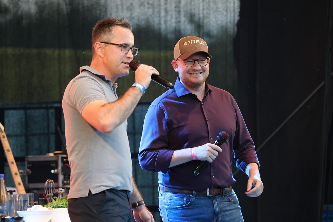 Teammitglied Jan-Philipp Repp fungierte als Moderator, während „Hausmeister“ Sascha Bell immer wieder mal mitmischte. Repp war zuvor in die Rolle von Malle-Sänger „Icke Hüftgold“ geschlüpft. Ein echter „Stargast“ war dagegen der Karbener Koch Reiner Neidhart, der auf der Bühne vegetarische „Eierblogger-Burger“ mit Paddys aus Puteneiern als Hauptzutat zauberte. Die wurden unter den Besuchern ebenso verteilt wie schon vorbereitete Wachteleier. Und dann gab es tatsächlich für jeden in der Arena ein Freibier. Da wurde kräftig geploppt.