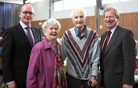 Anschließend begrüßte auch der Vorsitzende der Wölfersheimer Gemeindevertretung, Gerhard Weber, die Anwesenden. Er zeigte sich erfreut über die große Anzahl an aktiven Seniorinnen und Senioren in der Gemeinde und dankte ebenfalls allen Organisatorinnen und Organisatoren sowie Helfern, die einen solchen schönen Nachmittag ermöglichen. Gemeinsam mit Bürgermeister Kötter ehrte er die beiden ältesten Anwesenden. Dies waren Anna Becker mit 98 Jahren und Peter Pelech mit 93 Jahren.