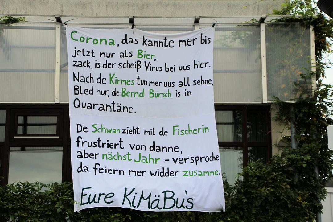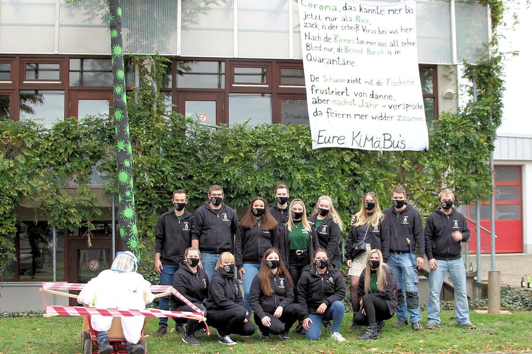 Die Kirmesburschen und -mädchen aus Berstadt wurden trotz der Absage aktiv und setzten am Kirmesfreitag ein starkes Zeichen. Nach einem kleinen Umzug durch die Dorfstraßen wurde der Kirmesbaum an der Mehrzweckhalle aufgestellt. Für die nötige Sicherheit sorgten extra angefertigte Mund-Nasen-Bedeckungen. Der schwarz gestrichene Baum war mit grünen Corona-Viren, Desinfektionsmittel und Masken geschmückt.