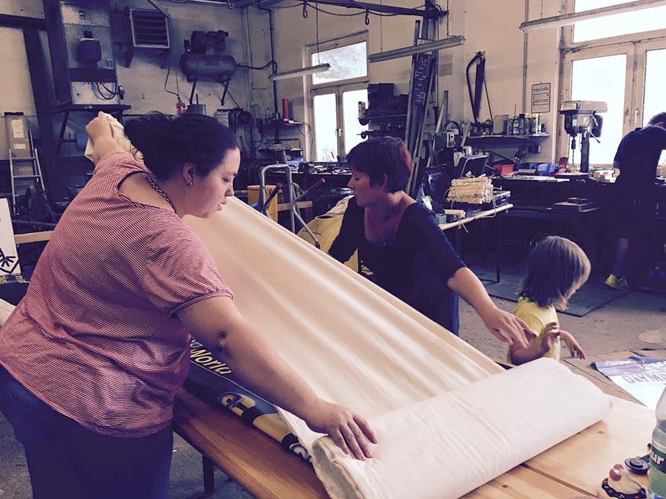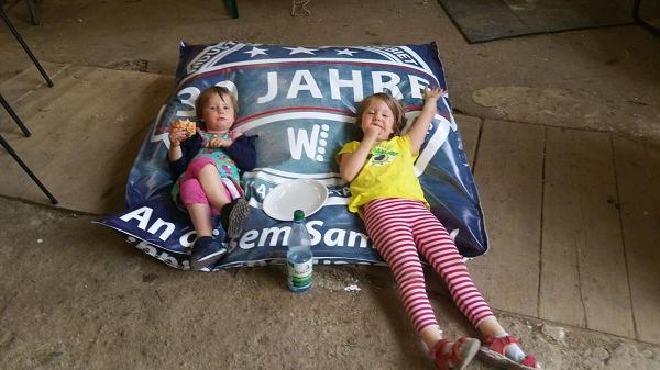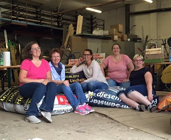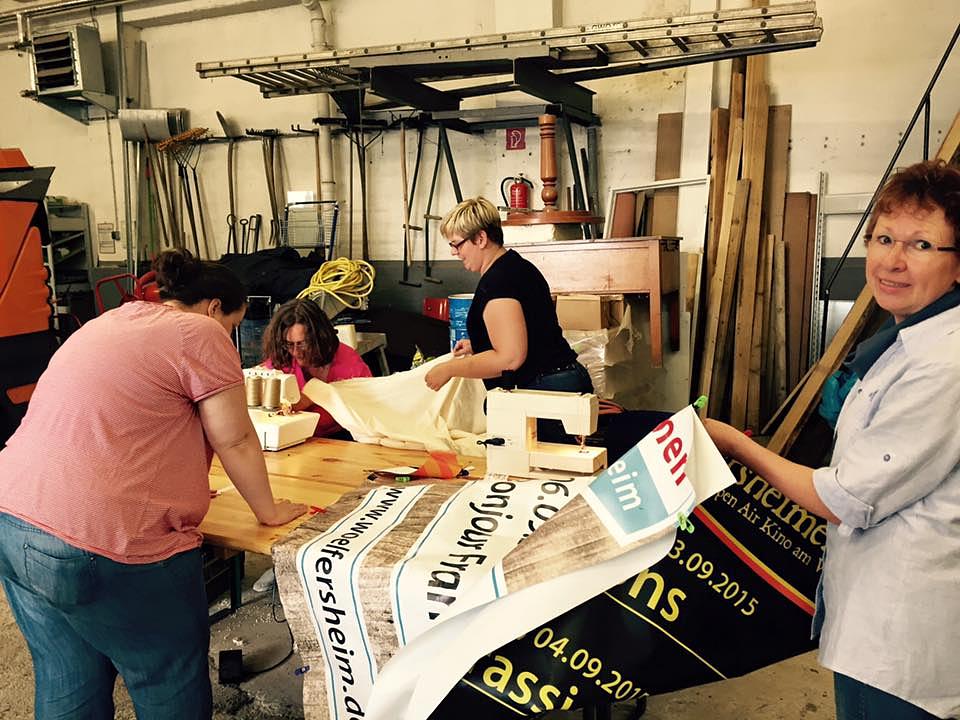 An einem Abend entstand daher ein Muster, das ausgiebig getestet wurde. Am vergangenen Samstag herrschte dann rege Betriebsamkeit auf dem Gelände des Wölfersheimer Bauhofes. Über Facebook wurde zu der kreativen Aktion aufgerufen und einige Nähbegeisterte folgten dem Aufruf. Das Muster wurde kritisch begutachtet, und es entstanden drei weitere bunte Sitzsäcke, die schon diese Woche beim Kinosommer zum Einsatz kommen sollen. Die großen Planen wurden zunächst zugeschnitten, und ein Reißverschluss wurde eingenäht. Anschließend wurden die Kanten zusammengenäht, so dass ein riesiger Bezug entstand, der die Füllung vor Feuchtigkeit schützt. Zum Abschluss wurde ein großer Innensack genäht, der mit speziellen Styroporkugeln gefüllt und in den Bezug gesteckt wurde. Was sich leicht anhört, verlangte von den Ehrenamtlichen viel Geduld und Fingerspitzengefühl. Dennoch waren alle begeistert von der Aktion und den bequemen Ergebnissen. Ebenfalls begeistert zeigten sich die Helfer von den Halterungen für die Preislisten, die aus rustikalen Dachlatten gezimmert wurden. Göbel bedankte sich bei Anja Seebald, Ellen Kötter, Andrea Dey, Melanie Zinsheimer, Christine Anselm, Katharina Rüd und Fabian Schneider für die Unterstützung und lud die Helfer zu einem Besuch des Kinosommers ein.