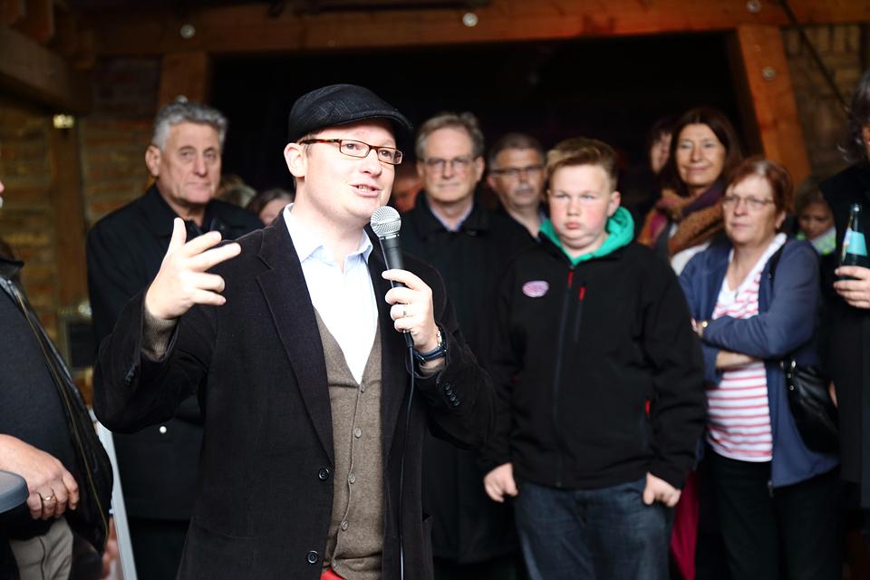 Bürgermeister Rouven Kötter ging in seiner Begrüßung auf das Konzept des Marktes ein. Abgesehen von den Wintermonaten soll ab April 2014 monatlich immer am ersten Samstag ein Markt stattfinden. Dort wird jeweils eine andere Region zu Gast sein, aus der Aussteller begrüßt werden können. Auch Märkte zu bestimmten Themen seien denkbar. Kötter dankte allen, die an der Realisierung beteiligt waren. Besonderen Dank richtete er an die Planer Rainer Tropp und Wolfgang Isack, die beteiligten Baufirmen, Bauabteilungsleiter Thomas Größer und den zuständigen Fachbereichsleiter Manfred Meißner für das Engagement während der Bauphase, den Kulturbeauftragten Sebastian Göbel, der das Konzept der Märkte entwickelt hat und künftig umsetzen wird, und die Mitarbeiter des Bauhofes, die bei der Realisierung stark eingebunden sind. Besonderen Dank richtete er auch an Helmut Rieß, Hugo Rieß und Rainer Lind, die der Gemeinde alte Geräte zur Dekoration überlassen haben, die Familie Hofmann, die den Markt auch mit Begeisterung unterstützt hat, und an alle Aussteller, die sich auf das neue Konzept eingelassen haben. Im Anschluss trug Planer Rainer Tropp als Grußwort ein Gedicht über die neue Marktscheune vor.