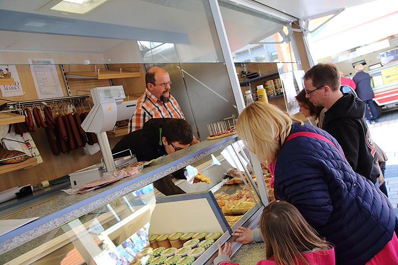 An den Ständen boten die Aussteller wieder eine gelungene Mischung hochwertiger Produkte. Gleich am Eingang des Geländes qualmte der Räucherofen von Stefan Klotzbücher, der darin Forellen frisch räucherte und auch Fischbrötchen im Angebot hatte. Wie üblich blieb keine einzige Forelle im Ofen hängen, und einige Besucher mussten auf Fischbrötchen oder die Angebote der anderen Anbieter ausweichen. Direkt nebenan befand sich der Verkaufswagen von Süßwaren Keil aus Schotten. Die in liebevoller Handarbeit hergestellten Schaumküsse waren zu großen Teilen ausverkauft. Wer zu spät kam, hatte bei der Frage nach seiner Lieblingssorte oft kein Glück mehr. Mit genügend Vorrat war das Wartenberger Dorfbräuhaus angereist. Die Besucher begeisterten sich hier besonders für das dunkle Vogelsberger Landbier, für das die Braumeister eigene Braugerste im Ort anbauen. Wer kein Freund von Bier ist, fand am Stand von Familie Hofmann verschiedene Fruchtweine und Säfte. Verschiedene und teils ungewöhnliche Kartoffelsorten weckten ebenfalls das Interesse der Besucher. Nebenan bot die Metzgerei Hofmann eine Kartoffelbratwurst vom Grill. In der Scheune selbst hatte die Käsekiste aus dem Hessenpark ihren Stand aufgeschlagen und bot erneut eine Auswahl leckerer Käsespezialitäten. In der Handarbeitsecke der Scheune boten Regina Gulde und Melanie Zinsheimer verschiedenste genähte und gestrickte Produkte. Im ehemaligen Stall präsentierte Katja Wittman ihre reichhaltige Auswahl an Likören und Gelees. Während Wittmann erstmals beim Markt beteiligt war, zählt Bernd Weiß zu den Stammgästen. Der Ulrichsteiner bot auch diesmal wieder Bauernbrot aus dem Holzbackofen und Hausmacher Wurst. Für die Verpflegung mit normalen Getränken sorgte der Elternbeirat der Kita Regenbogen, der mit süßen Crepes und Kaffee den perfekten Nachtisch bot. Für die musikalische Umrahmung sorgte Saxophonist Felix Waltinger.