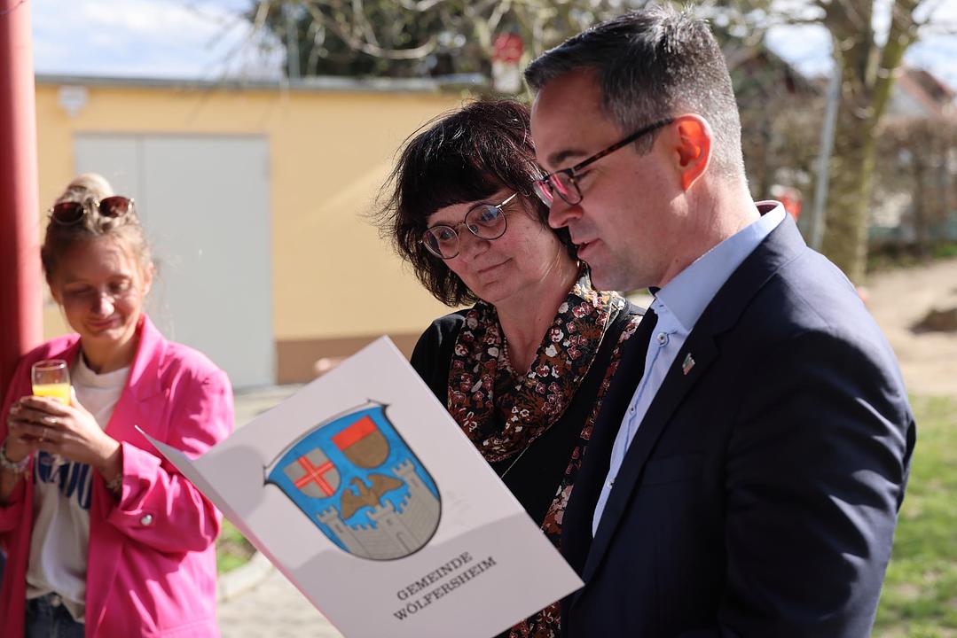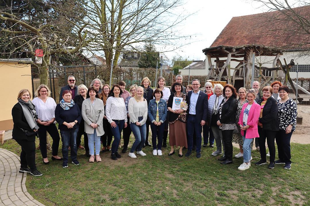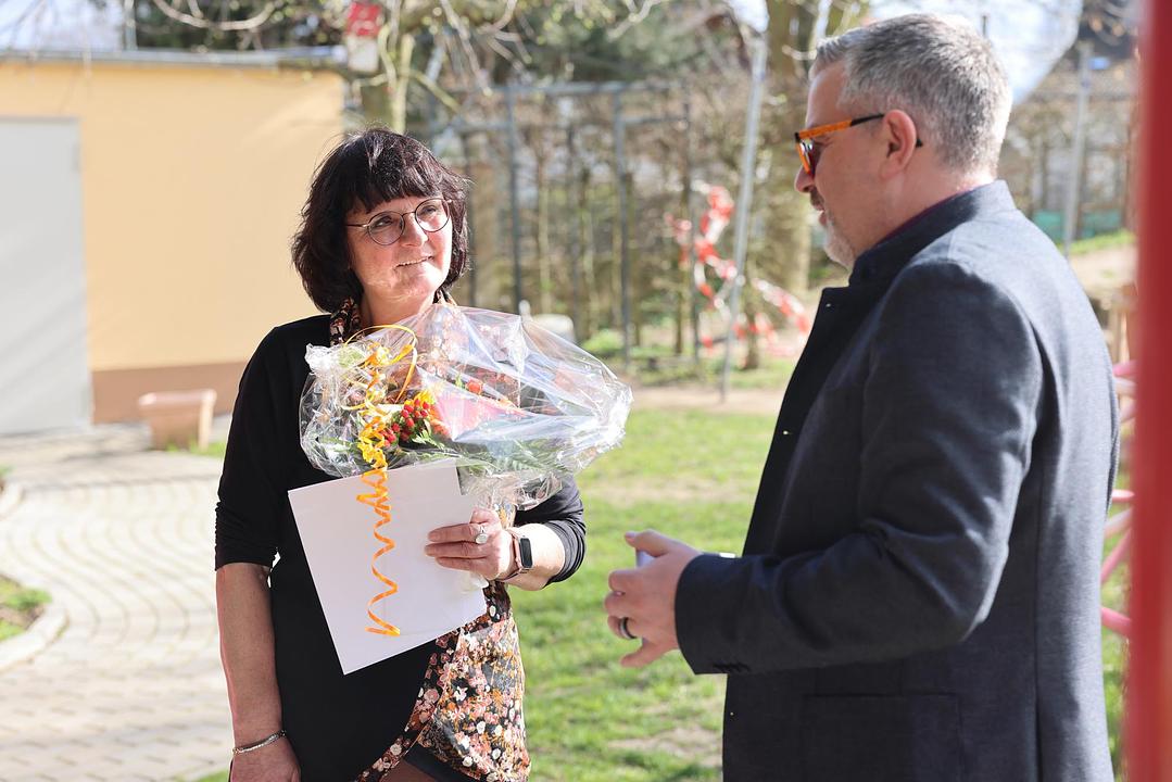 Nach einer kurzen Begrüßung blickten Bürgermeister Eike See und Hauptabteilungsleiter Markus Herrmann auf Dildines berufliche Laufbahn zurück. 1977 schloss sie ihre Ausbildung zur staatlich anerkannten Kinderpflegerin an der Wingertschule in Friedberg ab. Nach ihrer Tätigkeit als Kinderpflegerin im Kinderheim Butzbach und als Gruppenleiterin im Kindergarten in Rosbach verschlug es sie in den Odenwald, ehe es sie wieder in die Wetterau zurück zog. Zum 1. Januar 1994 trat sie in den Dienst der Gemeinde Wölfersheim ein. Zunächst als Springerin für alle Kitas und ab 1997 fest in der Kita Räuberhöhle in Melbach. Fachbereichsleiterin Nicole Stelzner-Lehmann dankte ihr für ihren langjährigen Einsatz. Sebastian Göbel vom Personalrat unterstrich die besondere Bedeutung des Kindergartens für den Ort und dass dies ohne die engagierten Kolleginnen sicher nicht so wäre. Kinder, die bei ihr den Kindergarten besucht haben, bringen inzwischen selbst ihre Kinder in die Kita Räuberhöhle. In all den Jahren arbeitete sie stets mit Einrichtungsleiterin Christina Mühl zusammen, die sich tränenreich verabschiedete und ihr ihren „Lieblingsstern“ überreichte. Der offizielle Teil endete mit einem Gruß und Liedbeitrag von Carina Hofmann für die Eltern. Auch zahlreiche aktuelle und ehemalige Kolleginnen und Kollegen waren zur Verabschiedung gekommen und nutzten die Gelegenheit Martina Dildine für die Zusammenarbeit zu denken. „Ich wünsche Martina Dildine für die Zukunft alles erdenklich Gute und vor allem Gesundheit und viel Zeit mit ihrer Familie. Ich danke ihr für ihren langjährigen Einsatz zum Wohle unserer Gemeinde und bin mir sicher, dass viele ihre herzliche Art vermissen werden,“ schließt Bürgermeister See ab.