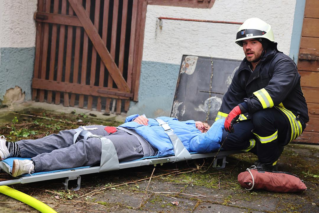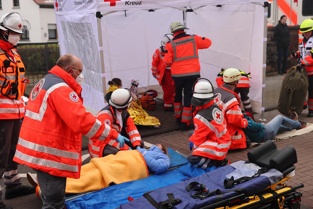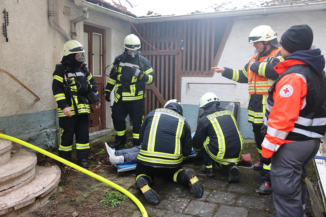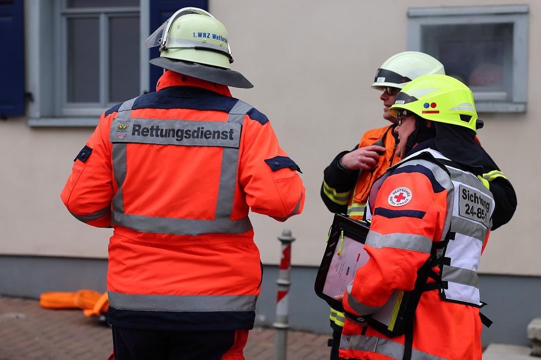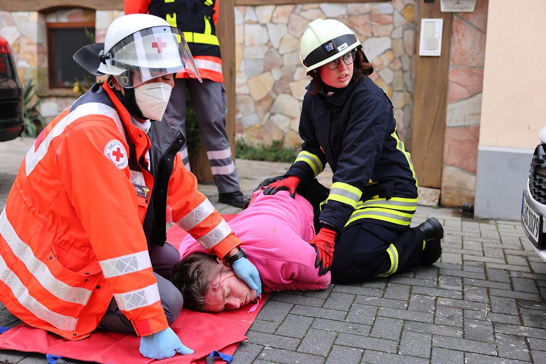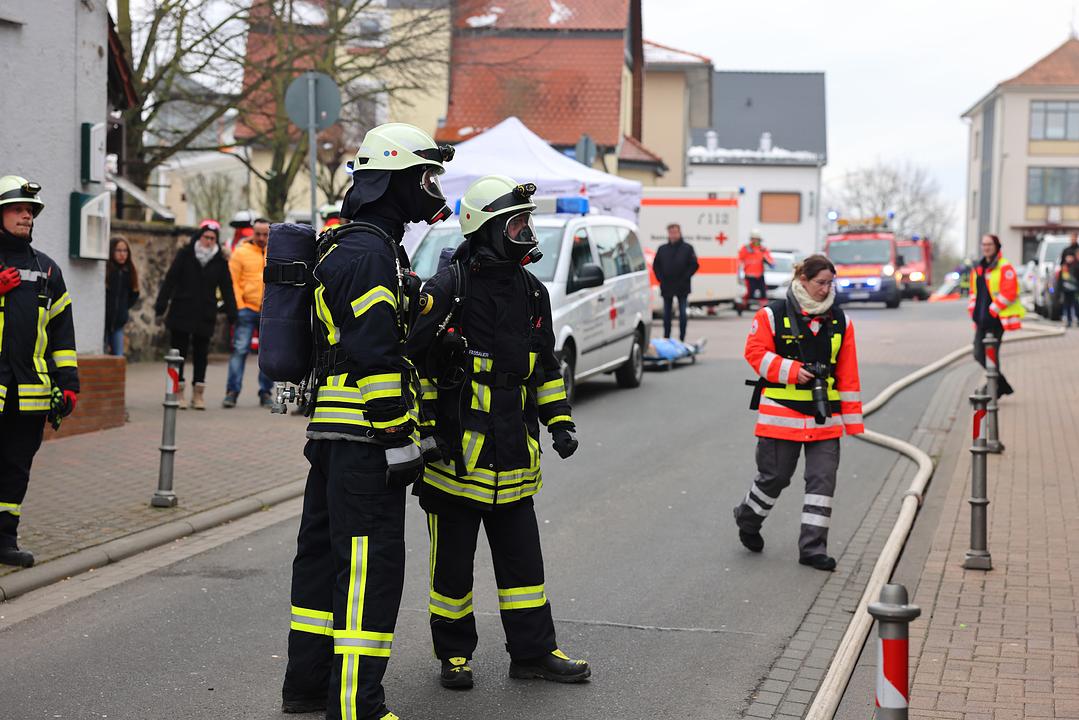 Bei der Auswahl des Übungsszenarios hat man sich von den anstehenden Arbeiten zur Erweiterung der Kinderstube inspirieren lassen. Bei Arbeiten im benachbarten Gebäude ist es zu einer Verpuffung der Heizungsanlage gekommen. Feuer und Rauch haben sich schnell im Gebäude ausgebreitet. Da bereits ein Durchbruch zur benachbarten Kinderstube hergestellt wurde, hat sich auch dort schnell der Rauch im gesamten Gebäude ausgebreitet. Insgesamt 10 Verletzte mussten aus den Gebäuden gerettet werden. Neben Rauchgasvergiftungen erlitten sie auch die verschiedensten anderen Verletzungen. Hier gilt den Notfalldarstellern des DRK Kreisverbandes besonderer Dank für die Unterstützung. Der DRK Ortsverband Wölfersheim hat sich der Übung angeschlossen und die Verletzten versorgt. Mehrere Auszubildende des Rettungdienstes waren aktiv in das Geschehen eingebunden. Mehrere Rettungswagen sorgten für ein noch realistischeres Bild.