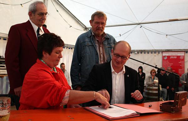 die Ratsschänke Sodila am Södler Kirchplatz. Neben dem Pächterehepaar Angelika und Gerhard Wolz sowie Bürgermeister Rouven Kötter und dem Ersten Beigeordneten Manfred Sauer nahmen mehr als 100 Zuschauer an der Unterzeichnung teil. Musikalisch umrahmt wurde das Prozedere von den Black Bandits, begossen wurde der freudige Anlass anschließend mit mehr als 100 Liter Freibier. Grund für die ungewöhnliche Vertragsunterzeichnung war die Södler Kirmes, denn dort auf der Bühne im Festzelt fand die Unterzeichnung nach dem traditionellen Fassbieranstich statt. Das Ehepaar Wolz, das im Wölfersheimer Ortsteil Wohnbach wohnt, betreibt momentan das Bürgerhaus in Okarben und wird die Ratsschänke Sodila im Januar eröffnen. Auf der Speisekarte wird gutbürgerliche Küche mit hessischem Einschlag stehen.