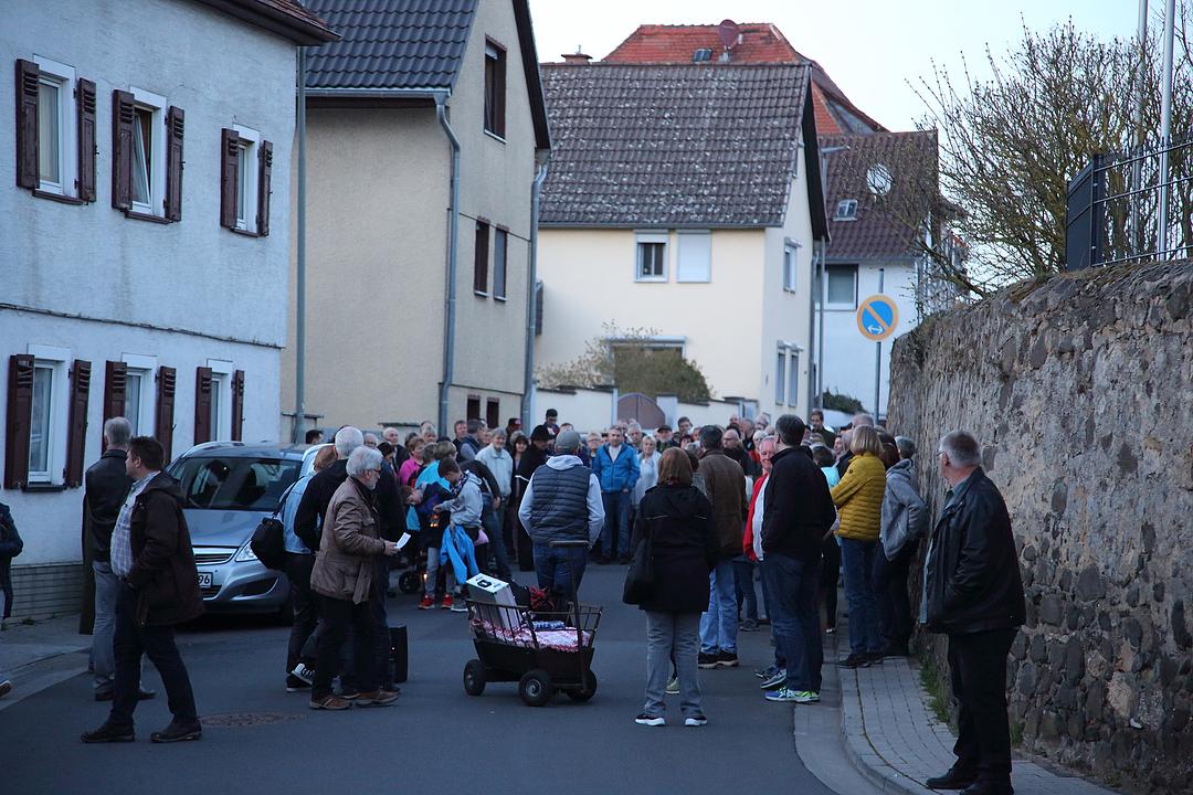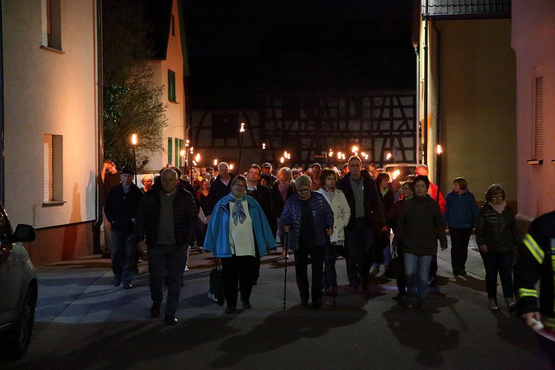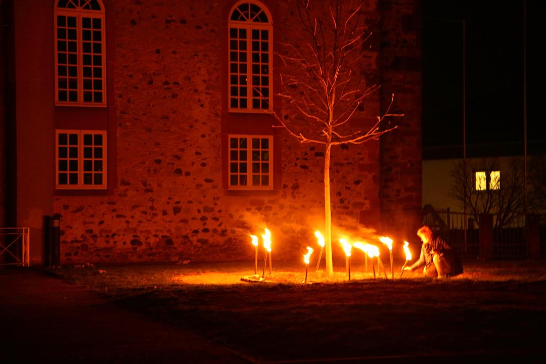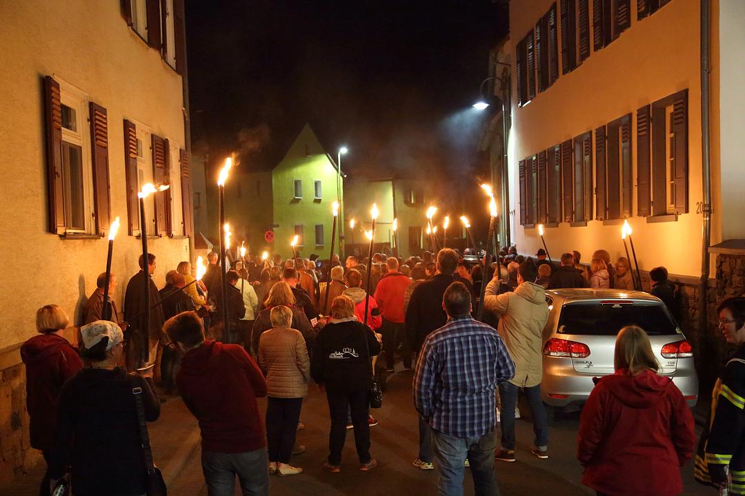 Inmitten des mehr als zweistündigen Rundgangs wurden große Fackeln verteilt, die die Szenerie in der Ortsmitte in ein sehr atmosphärisches Licht tauchten, fiel doch wenige Minuten später tatsächlich der elektrische Strom aus und die Teilnehmer konnten sich gut in die stromlose Zeit vor mehr als 100 Jahren zurückversetzen, denn die Elektrifizierung begann in Melbach erst im Jahr 1913. Der OVAG sei hier besonders für die Möglichkeit einer inszenierten, zeitweiligen Stromabschaltung unter der Absprache von Magda Gerlach gedankt. Letzte Station der nächtlichen Erlebnisreise in die eigene Vergangenheit waren der mittelalterliche Felsenkeller, der seit 2017 wieder zugänglich ist und der auch an diesem Abend bei den Besuchern Erstaunen und Bewunderung hervorrief. Der jetzige Besitzer der historischen Keller, Michael Heuser, hatte dankenswerter Weise seinen Keller für die Gäste geöffnet.