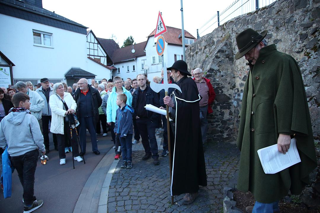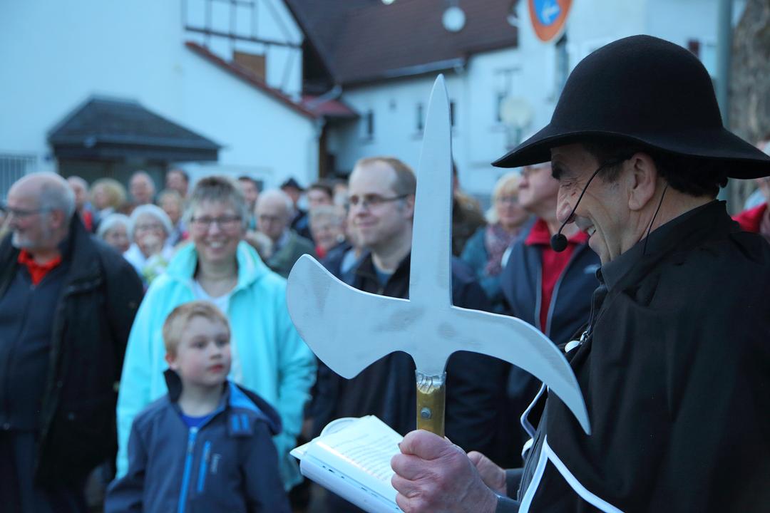 Angereichert mit zahlreichen spannenden Informationen und Anekdoten aus der Ortsgeschichte, lieferten sich beide Darsteller auch ein lebhaftes und humoristisches Rededuell. Drei besondere Spielszenen waren in den Dialog im Laufe der Streckenführung eingeflochten. So empörte sich ein braver Bürger (Manfred Schmitt) über den ungebührlichen Lärm auf der nächtlichen Straße, indem er seinen Nachttopf samt Inhalt aus dem Fenster auf die Straße entleerte. Am Haag erwischte der Nachtwächter einen „Blind- oder Fremdgänger“ (Eginhard Philippi), der nach einem Rendezvous auf dem nächtlichen Haag, der früher außerhalb der Besiedlung lag, auf der Flucht vor dem betrogenen Ehemann. In der Ortsmitte entwickelte sich ein heftiger Disput zwischen dem Nachtwächter und einer Anwohnerin(Heike Marloff), deren Huhn von einer anscheinend rücksichtslosen Autofahrerin (Magda Gerlach) überfahren wurde. Auf die ungläubige Frage des Nachtwächters, dass solch ein Huhn doch jedes Motorengeräusch fliehen würde, stellte sich heraus, dass die Autofahrerin in einem lautlosen Elektroauto unterwegs war. Der Nachtwächter (Volker Zorn) verurteilte sie daraufhin, kraft seines Amtes, zu Strafarbeiten im Stall des Wellerschen Hofes.