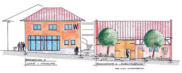 Zwei Gebäude sollen erhalten bleiben: Das Eckhaus, in dem sich der ehemalige Elektroladen Schlömp befand und die Scheune am Ende des Grundstückes Bahnhofstraße 4. Alle anderen Gebäude wurden bereits oder werden noch abgerissen. Anschließend sollen die beiden Grundstücke gemeinsam entwickelt werden, um Raum für wirtschaftliches und gesellschaftliches Leben zu bieten. Der ehemalige Laden an der Ecke Hauptstraße/Bahnhofstraße soll als Café und Bistro ausgebaut werden. Daneben entsteht ein Neubau, welcher über einen Zwischenbau mit dem Bistro verbunden sein wird. Dieser Neubau soll zweigeschossig sein und fügt sich somit in die historische Ansicht der Straßenzeile ein. Im unteren Bereich des Gebäudes werden Geschäftsräume zu finden sein. Der erste Stock steht als Büro- und Dienstleistungsräume zur Verfügung. Dabei wurde der erste Stock so konzipiert, dass die Einheiten gegebenenfalls auch bewohnbar sind. Das topographisch tiefer liegende Grundstück Bahnhofstraße 4 dient überwiegend als Stellplatzfläche für die Wohn- und Geschäftsräume. Die zu erhaltende Scheune wird baulich gesichert und in einer Niedrigbudgetbauweise in Schuss gebracht. „Mit der Wölfersheimer Mitte schaffen wir an zentraler Stelle unserer Gemeinde Raum für wirtschaftliches und gesellschaftliches Treiben. Während das Bistro und das angrenzende Geschäfts- und Dienstleistungshaus permanent genutzt werden sollen, stellen wir uns für die Scheune eine nur gelegentliche Nutzung für besondere Veranstaltungen vor. Unter dem Begriff „Marktscheune“ wollen wir versuchen, einen regelmäßigen Markt in Wölfersheim zu etablieren und dabei insbesondere unsere örtlichen Selbstvermarkter einzubeziehen.“ erläutert Wölfersheims Rathauschef Rouven Kötter.