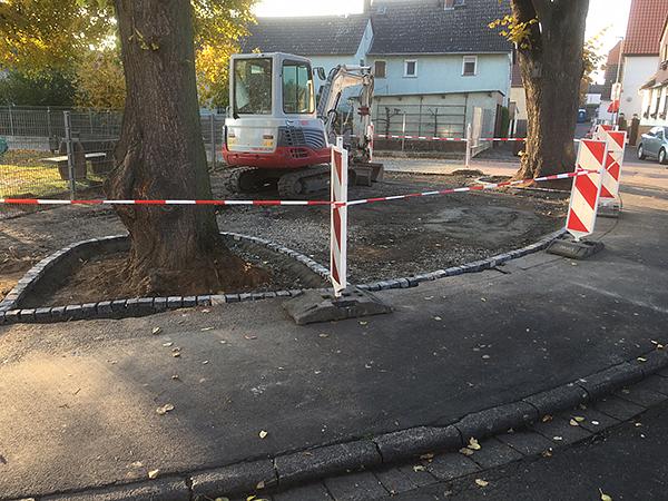In den letzten Tagen wurde daher der Zaun um einige Meter nach hinten versetzt. Anschließend wurde die Grasnarbe abgetragen und eine Einfassung aus Natursteinpflaster verlegt. Der Platz erhielt einen Belag aus dunklem Felsenkies. In den nächsten Wochen werden Poller und Gambionen installiert um zu verhindern, dass Fahrzeuge die Fläche befahren. Im nächsten Frühjahr werden die vorhandenen Bänke ersetzt und Pflanzkübel aus Naturstein installiert