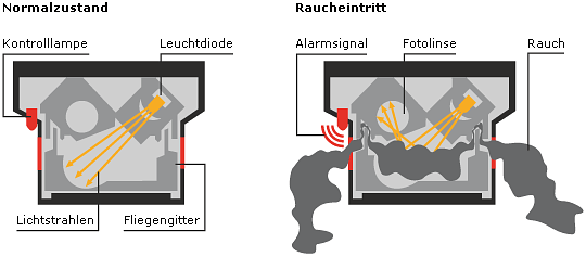 In einer Rauchkammer befinden sich eine Lichtquelle und ein Lichtempfänger; das mehrfach pro Minute ausgestrahlte Licht trifft nur dann den Empfänger, wenn es durch Rauchpartikel umgelenkt wird – gleichzeitig wird ein lauter (85 dB) Alarm ausgelöst.