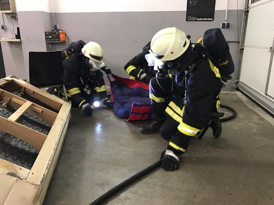 Der Angriffstrupp musste nun die bewusstlosen Dummys retten. Bedingt durch den dichten Rauch und den relativ warmen Temperaturen in den Räumen wurde die Rettung zu einer schweißtreibenden und körperlich anstrengenden Angelegenheit.