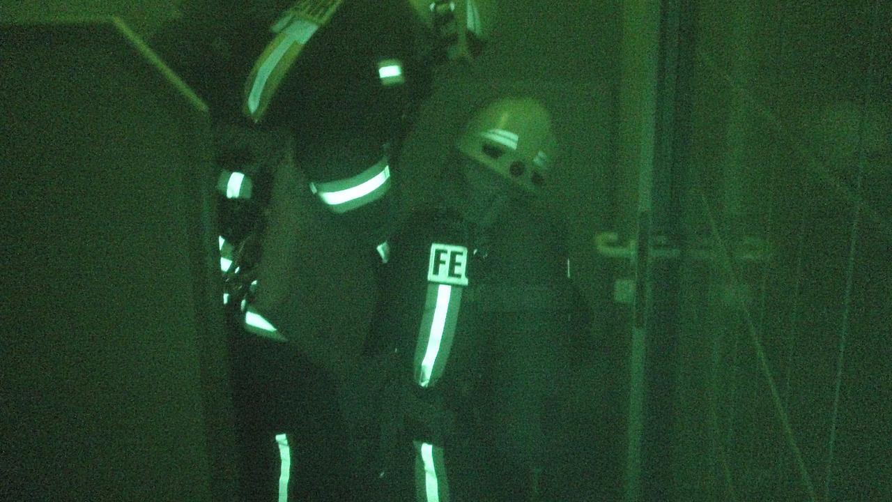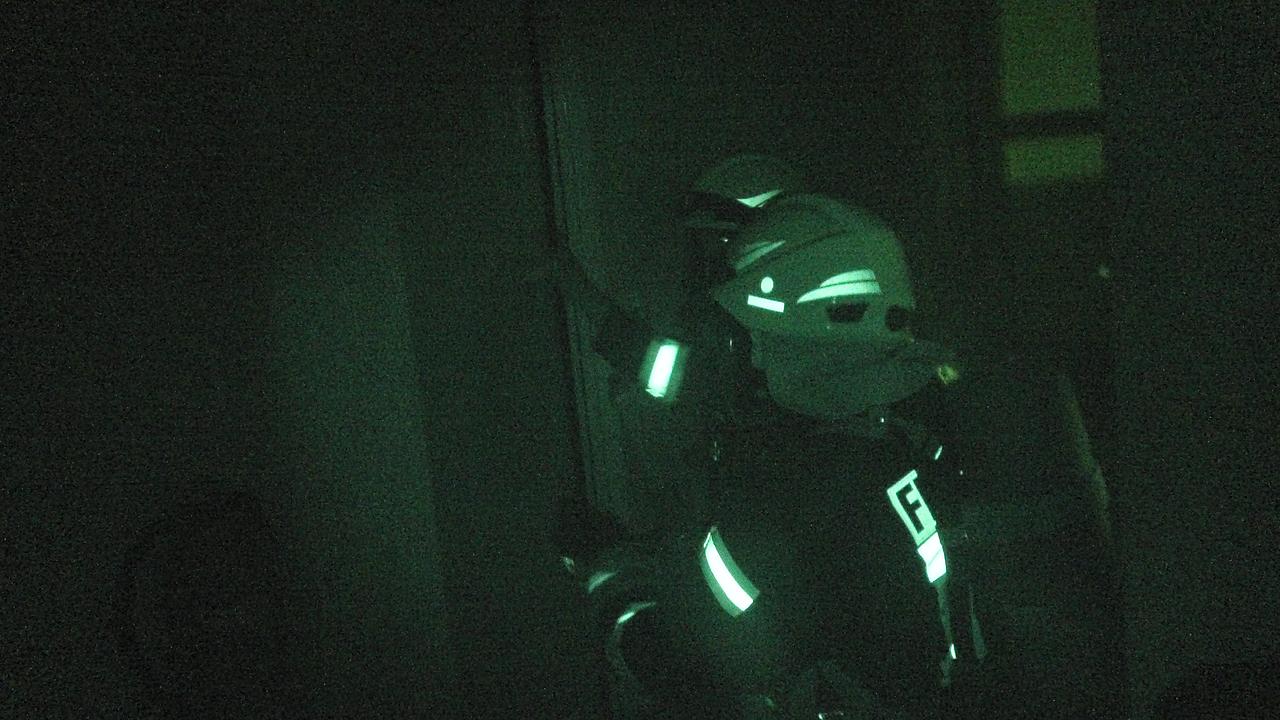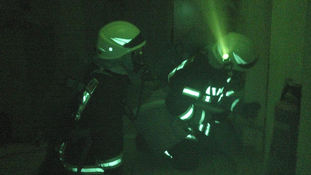 Nach einer ersten Erkundung des Gebäudes konnte durch den Gruppenführer zunächst kein Brandherd festgestellt werden. Aufgrund der Notrufmeldung erhielt der Angriffstrupp den Befehl die Personensuche zum Eigenschutz unter Atemschutz vorzunehmen.