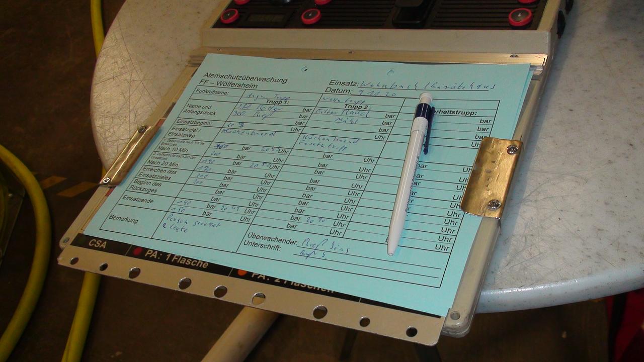 Auch diejenigen, die im Einsatz die Atemschutzüberwachung durchführen (i. d. R. Melder oder Maschinisten), wurden an der Übung beteiligt. Die Atemschutzüberwachung ist ein wichtiges taktisches Hilfsmittel, um die Sicherheit der Atemschutzgeräteträger zu erhöhen. Sie ist eine Unterstützung der unter Atemschutz vorgehenden Trupps bei der Kontrolle ihrer Behälterdrücke. Außerdem erfolgt durch sie eine Registrierung des Atemschutzeinsatzes.