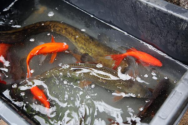 Das Wasser wurde zunächst abgepumpt, und die zahlreichen Fische wurden mit Köchern gefangen. Somit konnten die Innenwände und der Boden des Beckens gereinigt werden. Nachdem wieder genügend Wasser aufgefüllt war, konnten die Fische am Nachmittag wieder zurück in ihr Becken. Dort fühlen sie sich anscheinend pudelwohl. Ständig läuft frisches Wasser aus der Brunnenkammer am Bornberg in das große Bassin. Neben einer kaum zählbaren Anzahl an Goldfischen in allen Variationen und Größen finden auch ein mit ca. 50 Zentimeter Länge recht stattlicher Wels und mehrere Karpfen ein Zuhause in der Ortsmitte. Die Anzahl der Fische nimmt von Jahr zu Jahr zu, so dass einige von ihnen nun Asyl in der Södeler Weed gefunden haben und dort ständig frisches Wasser aus dem Brunnen am Kirchplatz bekommen. Ob das Södeler Wasser den Wölfersheimer Fischen gut bekommt, wird sich bei der nächsten Reinigungsaktion in Södel zeigen. Das Blub beim Aussetzen zeugte von Begeisterung.