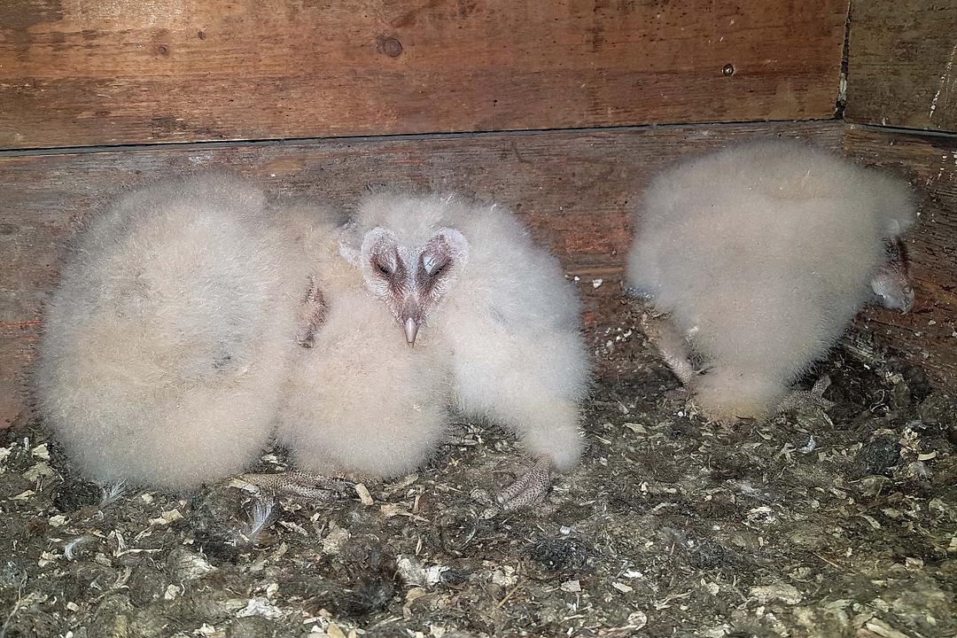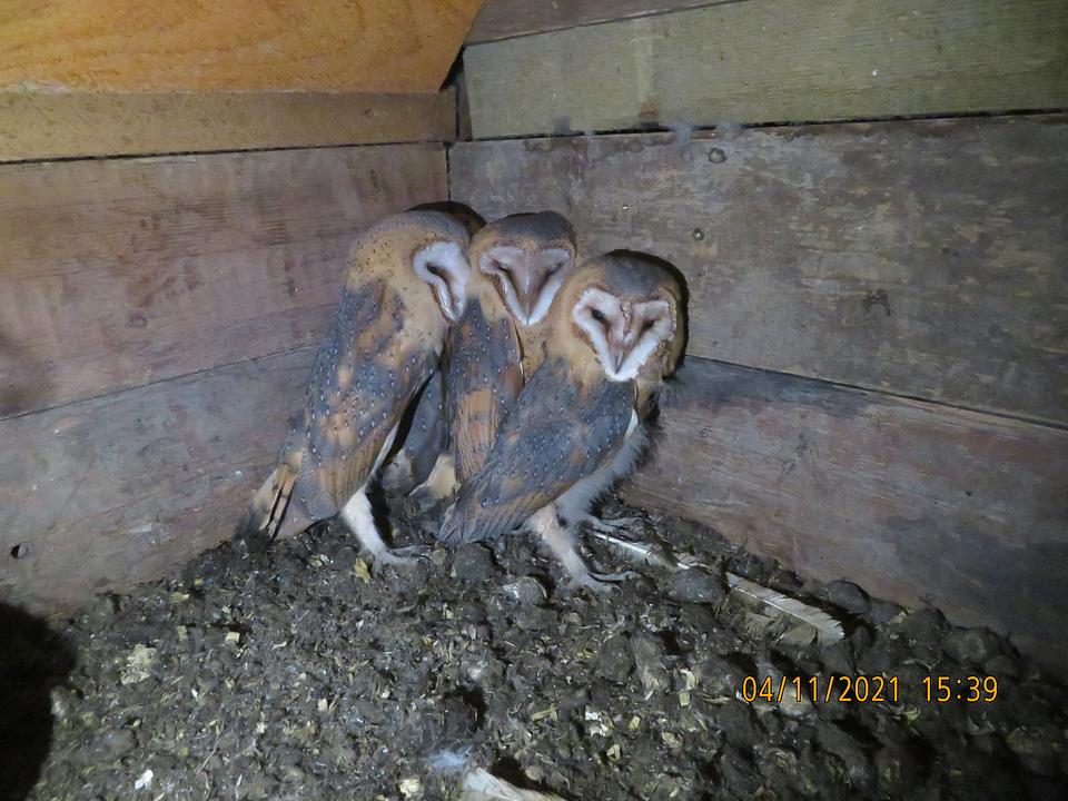 Ein Highlight hatten wir September – Oktober. Wir wurden über eine Brut von 4 Schleiereulen in einem privaten Kasten informiert. Dort konnten wir das Heranwachsen der Eulen über Wochen beobachten und dokumentieren. Ein super Erlebnis.