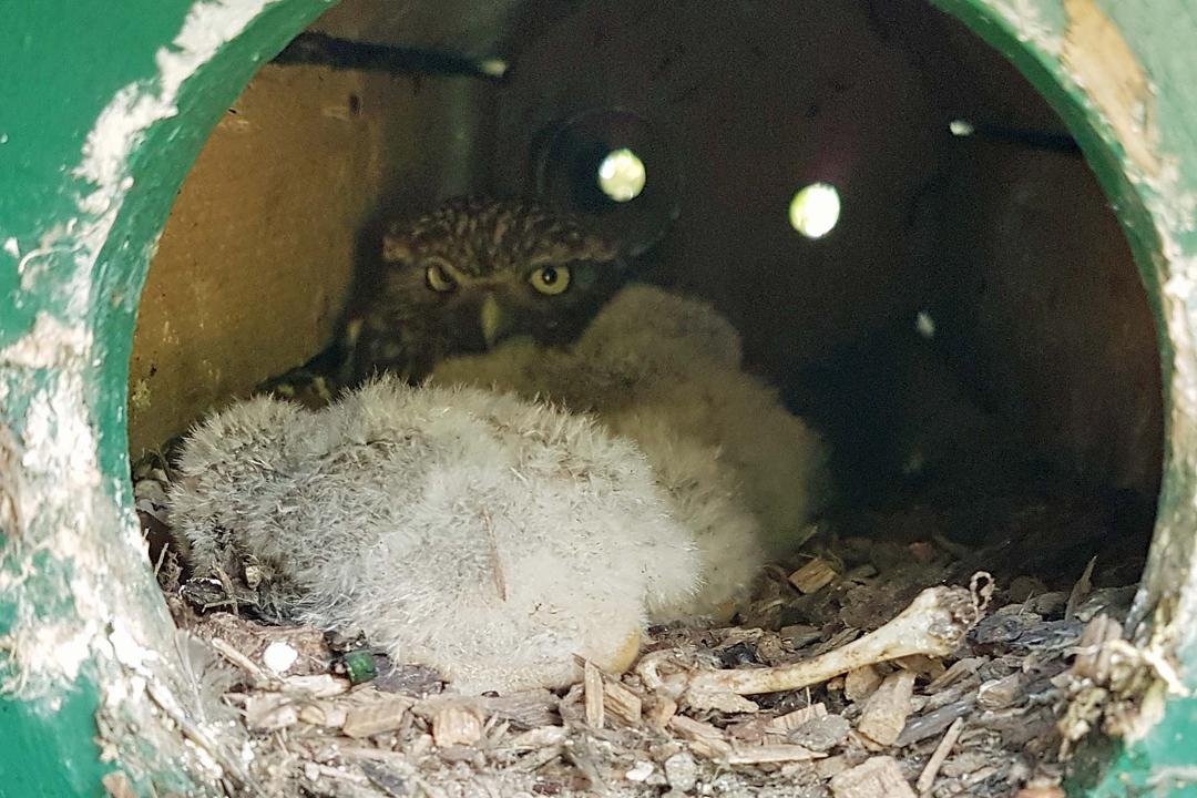 Im Mai – Juni wurde dann der Bestand an Jungvögeln in den Steinkauzröhren kontrolliert. Bedingt durch die Trockenheit waren wir etwas skeptisch. Wir wurden aber positiv überrascht, 35 Jungvögel konnten beringt werden.