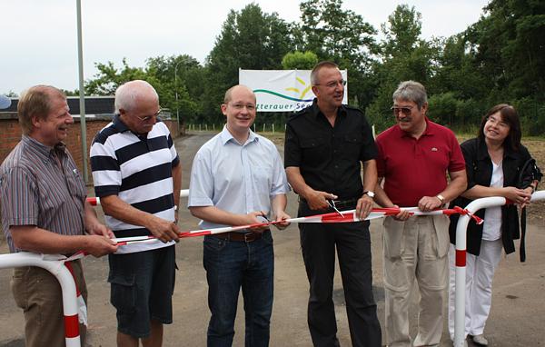 Anschließend schritten Kötter und Arnold zur Tat und schnitten, unterstützt durch die Ausschussvorsitzenden und den Gemeindevertretervorsitzenden, das Band des Rundweges durch und eröffneten ihn damit offiziell. Gemeinsam machten sich alle Anwesenden auf die rund 5 km lange Strecke und lauschten dabei immer wieder den interessanten Ausführungen von Kötter und Arnold. Während Landrat Arnold Interessantes zur Geschichte des Areals parat hatte, wusste der Wölfersheimer Rathauschef Rouven Kötter über die aktuellen Entwicklungen zu berichten. „Mit dem Abschluss des 1. Bauabschnittes ist es nun erstmals möglich, nicht nur von der Ortslage über die alte Kraftwerksstraße direkt an den See zu gelangen, sondern ihn auch trockenen Fußes zu umrunden. Dies ist jedoch erst der erste Schritt. Die weiteren Planungen sehen vor, den gesamten Rundweg so zu befestigen, dass er mit einer Asphaltdecke ausgestattet ist. Auch Inliner-Fahrer, Rollator-Benutzer oder Rollstuhlfahrer sollen die Möglichkeiten unseres Sees nutzen können.“ so Kötter. Darüber hinaus sei eine historische Beschilderung in Arbeit, die gemeinsam mit dem Verein zur Pflege der Bergbau- und Kraftwerkstradition konzipiert wird. Damit soll der Rundweg ausgeschildert werden, sowohl bezüglich der aktuellen Entwicklung als auch bezüglich der historischen Bedeutung des Sees. „Die weitere Entwicklung unseres Wölfersheimer Sees ist ein spannendes Projekt. Eines ist dabei klar: Wir werden die einmalige Chance, die sich daraus ergibt, nicht verspielen und vor allem keine Flächen mehr aus der Hand geben. Der Wölfersheimer See soll für die Menschen aus Wölfersheim und der Region dauerhaft ein Quell der Erholung und eine attraktive Möglichkeit zur Freizeitgestaltung sein.“ stellte Kötter klar.