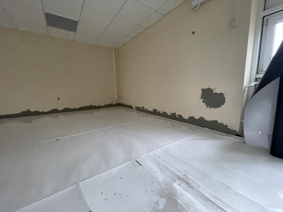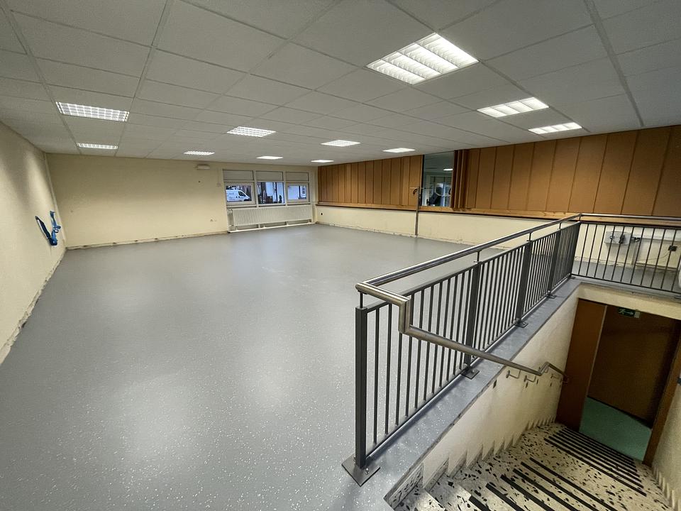 Nachdem der Raum komplett ausgeräumt war, konnte vergangene Woche der Boden ausgetauscht werden. Die in die Jahre gekommenen PVC-Fliesen wurden abgetragen, Unebenheiten ausgeglichen und ein neuer Bodenbelag aufgebracht. Zum Beginn der Woche hat Objektbetreuer Markus Marx mit den Malerarbeiten begonnen. Nicht mehr benötigte Kabelkanäle und Schalter wurden entfernt und viele Flächen mit Putz ausgebessert. Im nächsten Schritt sollen die Wände im Raum und im Treppenaufgang einen neuen Anstrich erhalten. Nach Abschluss aller Malerarbeiten wird mit den Arbeiten am Bodenbelag fortgefahren. Im Raum selbst sollen noch Bodenleisten verlegt werden und auch der Treppenaufgang soll einen modernen Bodenbelag erhalten.