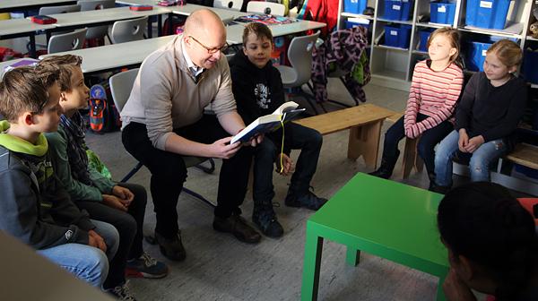 Der Vormittag spiegelte auch die unterschiedlichsten Lesegewohnheiten wider. Bürgermeister Rouven Kötter entschied sich beispielsweise für einen Klassiker von Erich Kästner „Die Konferenz der Tiere“. Eine spannende Geschichte, der die Schüler mit gespitzten Ohren lauschten. Göbel hingegen entschied sich für die Olchis von Erhard Dietl, die er von seinem iPad vorlas. Auch wenn die Kinder hiervon begeistert waren, entscheidend war die Geschichte, die für einige Lacher sorgte und selbst die unruhigsten Schüler fesselte. „Wir haben uns am Vorlesetag beteiligt, um die Schüler für das Lesen an sich zu begeistern“, sind sich Kötter und Göbel einig.
