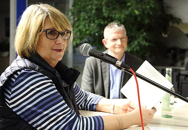 Nach einer kurzen Begrüßung durch den Kulturbeauftragten Sebastian Göbel übergab dieser das Mikrofon an die beiden Autoren. Den Anfang machte Jule Heck aus Münzenberg, die eigentlich Jutta heißt und Parallelen zu realen Personen in ihren Büchern zunächst gar nicht geplant hatte. Bei ihrem ersten Buch hatte sie Personen frei erfunden. Es haben sich jedoch viele Leute in den Personen erkannt, und so ging sie dazu über, ganz bewusst reale Personen mitspielen zu lassen. Nicht immer sei das einfach, und sie habe schon eine kleine Warteliste. Heck las aus verschiedenen Stellen ihres Buches „Schönes Biest“. Es ist ihr drittes Buch unter dem Titel „Tod im Schatten der Burg“. Sie gab den Zuhörern einen Einblick in die Geschichte. Das spannende Ende allerdings müssen die Zuhörer selbst lesen.