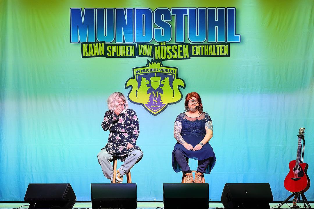 Der Titel ihres Programms liest sich wie eine Warnung und eine solche in Form von „Vorsicht, Lachsturm!“ hätte auch am Eingang der Wetterauhalle stehen können. Was Mundstuhl an diesem Abend boten, war ein Feuerwerk an Spitzen und Scherzen, die manchmal bewusst die Grenzen des guten Geschmacks streiften. Ihr humoristisches Feingefühl ließ selbst Tabuwörter charmant und witzig erscheinen, womit sie eindeutig den Nerv des Publikums trafen. Mundstuhl zeigten ihr Können durch eine Reihe von Charakteren, die sie mit Geschick zum Leben erweckten. Von den ostdeutschen Hartz-IV-Müttern Peggy und Sandy über das verstrahlte Friedensaktivisten-Duo Malte und Torben bis hin zu den skurrilen Zauberern Siegroy und Fried – jedes Alter Ego trug dazu bei, dass die Lacher kein Ende nahmen.