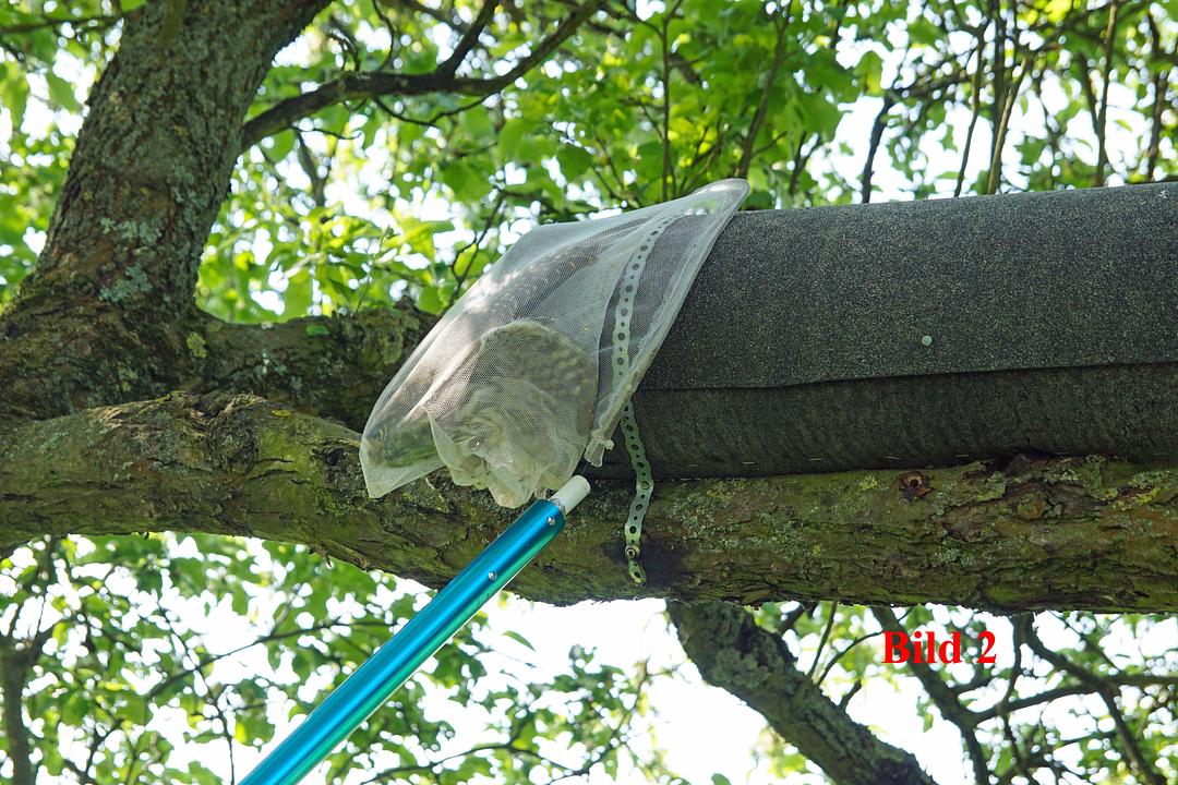 Bild 1; Kontrolle einer Röhre. Die Einflugöffnung wird mit einem Netz verschlossen. Durch die Reinigungsöffnung kontrollieren wir die Röhre.
