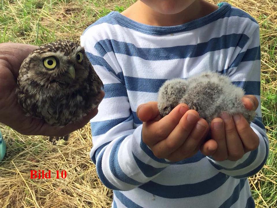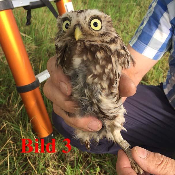 Bild 2; Steinkauz am Ausflugloch im Netz gefangen. Wir fangen sie aus zwei Gründen: a) Der Vogel soll nicht in Panik wegfliegen. Wir halten ihn fest und setzen ihn dann wieder durch das Einflugloch in die Röhre. b) Wir kontrollieren ob er beringt ist. Wenn nein, bekommt er einen Ring, wenn ja, melden wir die Ringnummer an die Vogelwarte Helgoland.