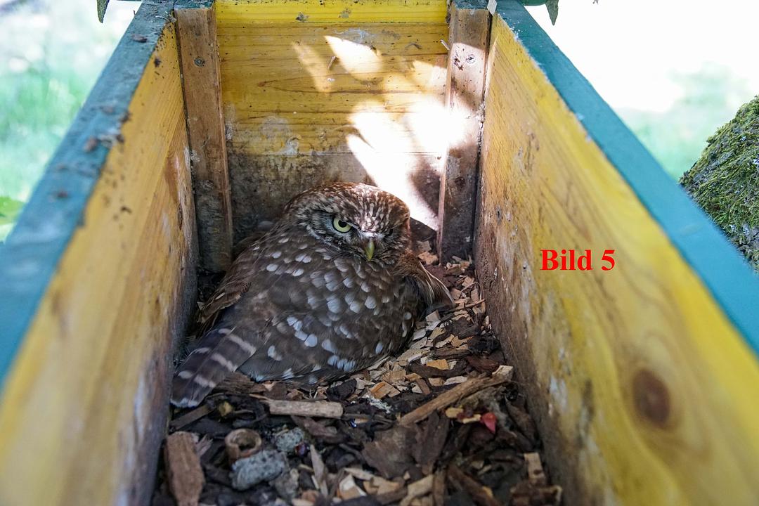 Bild 5; Brütender Steinkauz am 11. Mai. Wenn er auf den Eiern sitzt verlässt er so gut wie gar nicht die Röhre und lässt sich auch nicht durch unsere Kontrolle stören.